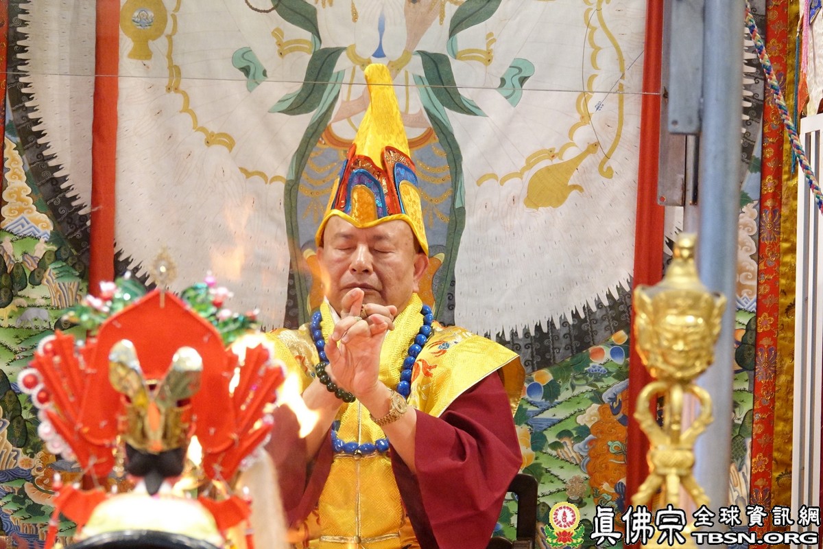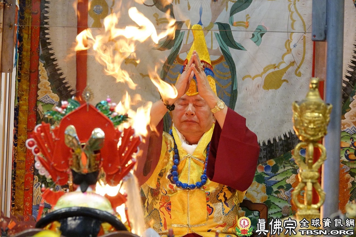 下午二點三十分,釋迦摩尼佛大法會正式拉開序幕,師尊點燃護摩火,頓時熊熊火焰沖天,咒音攝人心魄,與會大眾齊誦「釋迦摩尼佛心咒」,手結「釋迦摩尼佛手印」,覌想在烈焰中與釋迦摩尼佛、火天神合一,進入火光三昧。師尊在火光中演化息災、增益、敬愛、超度大手印,在陣陣法流的加持下,祈望能夠除一切的業障,煩惱。