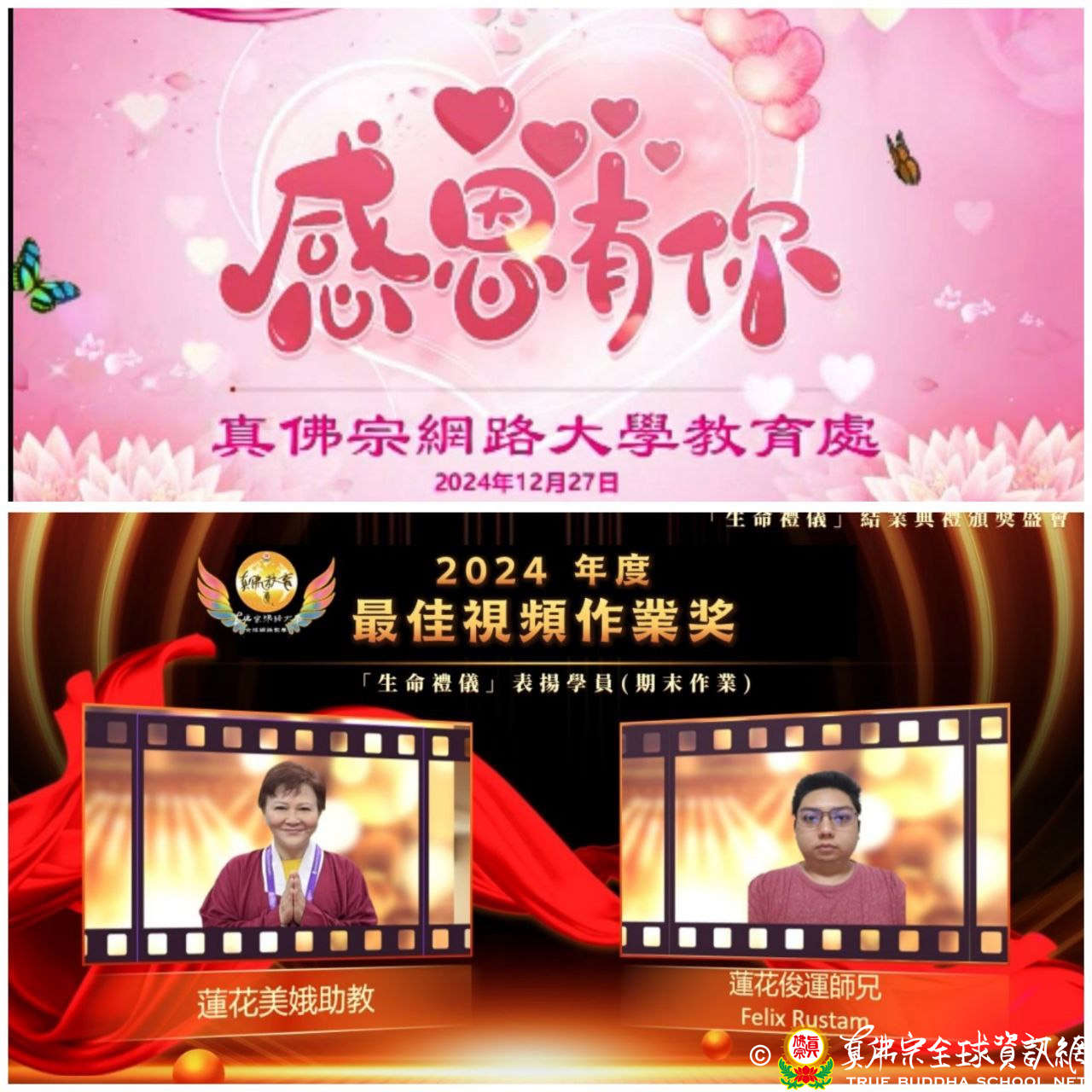 影片帶著我們走進時光隧道,回憶課程的片段,我們讚嘆蓮飛上師將真佛密法巧妙地融入新人的福證儀式中,喜氣洋洋佛光注照。我們跟著蓮悅上師小心翼翼地蓋上往生被、點金剛砂、做三光加被……。我們聽著舞自在師兄如何將真佛密法與殯葬習俗結合。接著是主持人閃亮登場、英文及印尼文現場翻譯、以及學員們無數的提問和認真上課的影像,回顧這一年中,每個週五難得的學習旅程,溫暖且充滿感動。