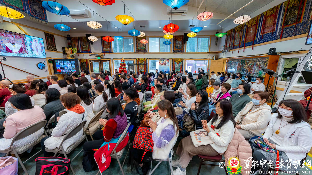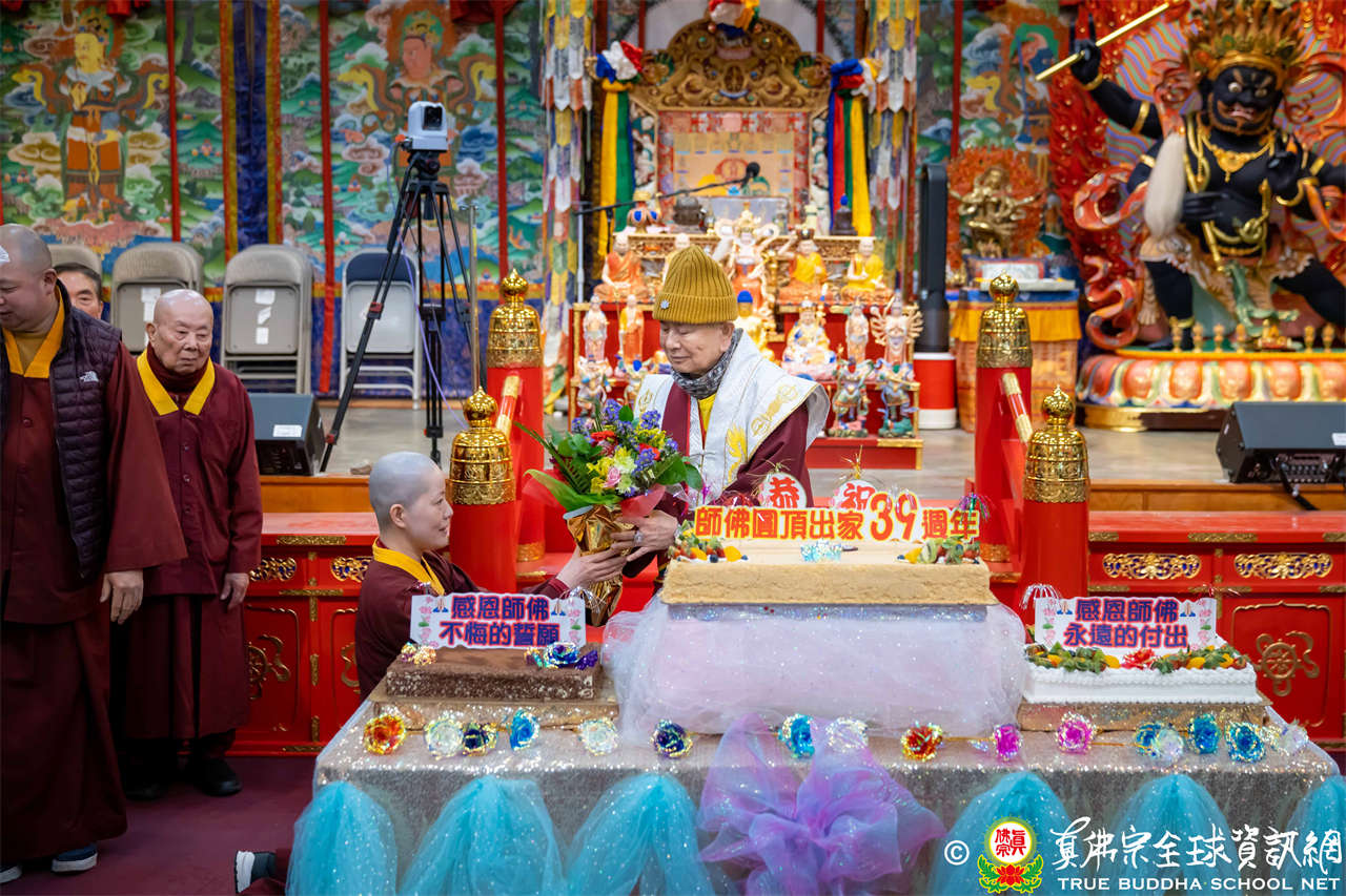 2025年3月9日,西雅圖彩虹雷藏寺恭請聖尊蓮生法王主壇蓮花童子護摩法會。當天適逢農曆二月初十,亦是法王出家39週年的紀念日。護摩儀式結束後,現場播放由宗委會製作的出家39年紀念影片,隨後,法王更即興唱起印尼文生日歌,為這特別的日子增添歡樂氛圍。