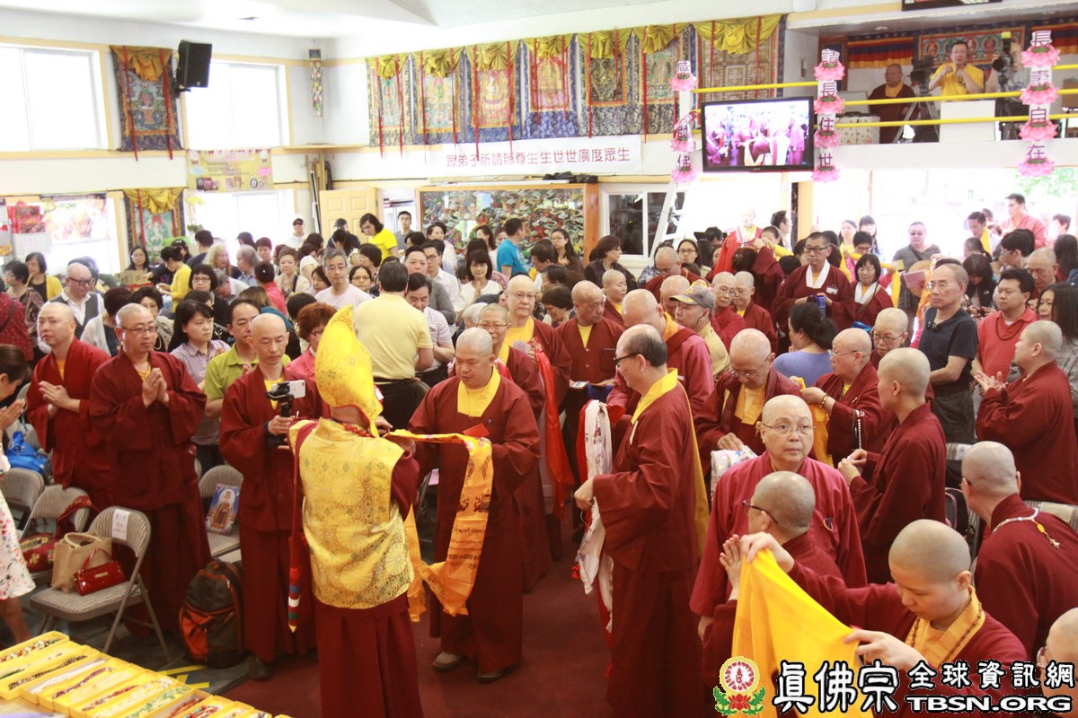 是日,護摩寶殿一大早就座無虛席,廖東周大使伉儷也出席參加,中午12點,四眾弟子熱情溫馨地恭迎法王聖尊進入大飯店共進午餐,此次的午餐加洲四大媽特地在用餐時供養了很多的笑話,逗得師尊及大家樂開懷,笑聲連連。