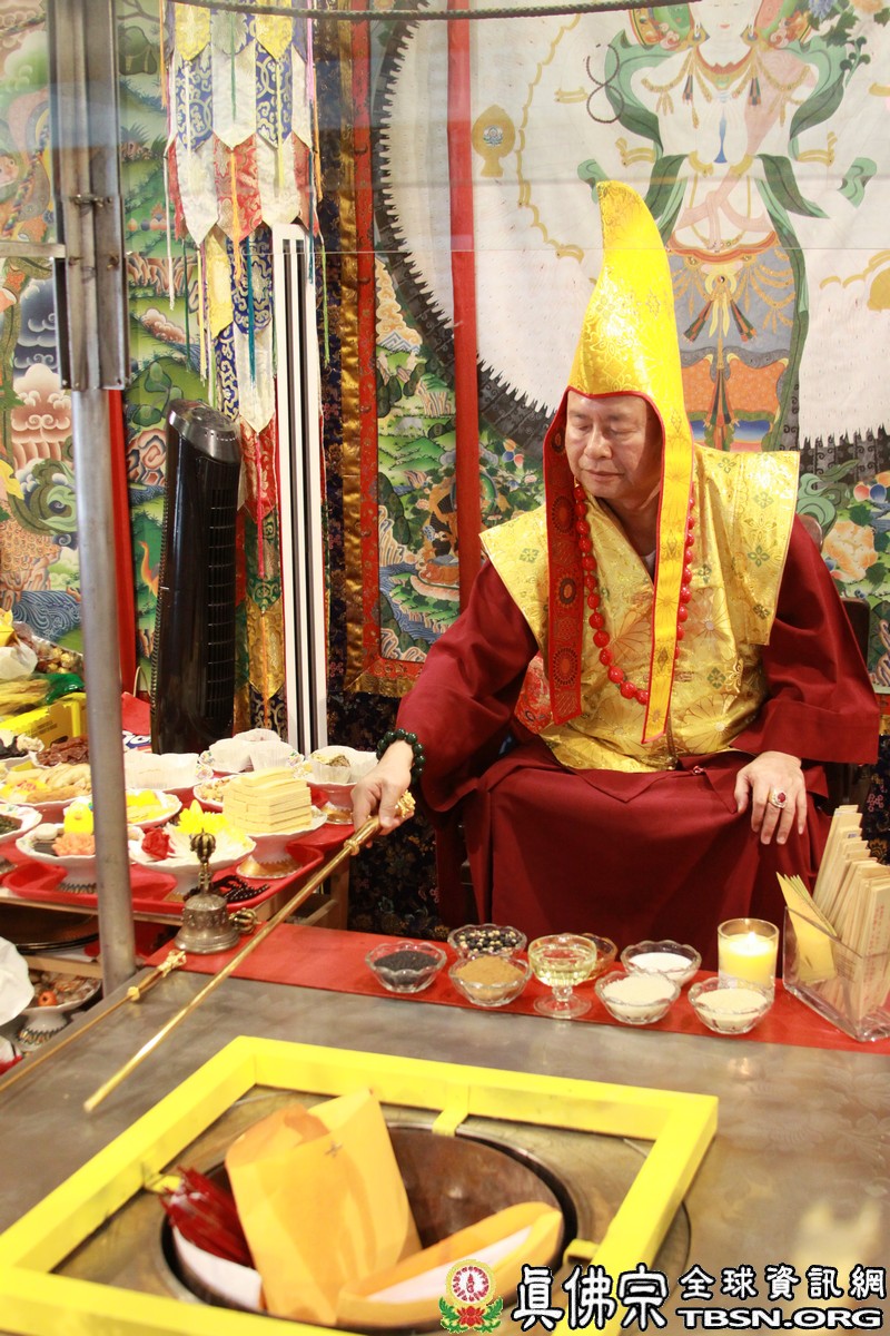 下午三時,法會正式開始,四眾弟子恭迎聖尊蓮生法王及上師團法駕護摩寶殿。法會進行期間,聖尊演化優美殊勝的手印,現場靈氣充滿,威力曼妙的「嗡。金母悉地。吽。」咒音,響徹整個護摩殿;行者、火與本尊,三者融合為一,讓所有參加者在熊熊的護摩火焰中,淨化一切身心的業障。