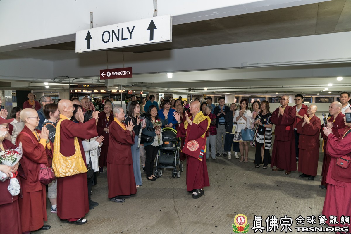 當師尊、師母出現的那一剎,激動的心、熱烈的掌聲,感覺血是沸騰的,心是高漲的。師尊、師母那熟悉的慈愛笑容、親切的問候,讓大家久久感動不已。廖東周大使伉儷,也聯袂特地從加州趕到西雅圖機場來迎接師尊、師母,西雅圖中國城的麥顯輝師父也親自領了醒獅隊,在機場敲鑼打鼓、舞動雄獅。許多機場的旅客都駐足觀望,甚至拿手機拍照錄影,有幸見聞這親切熱鬧的場面。