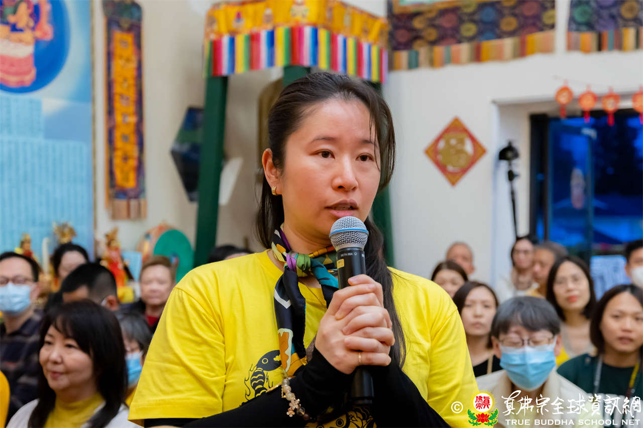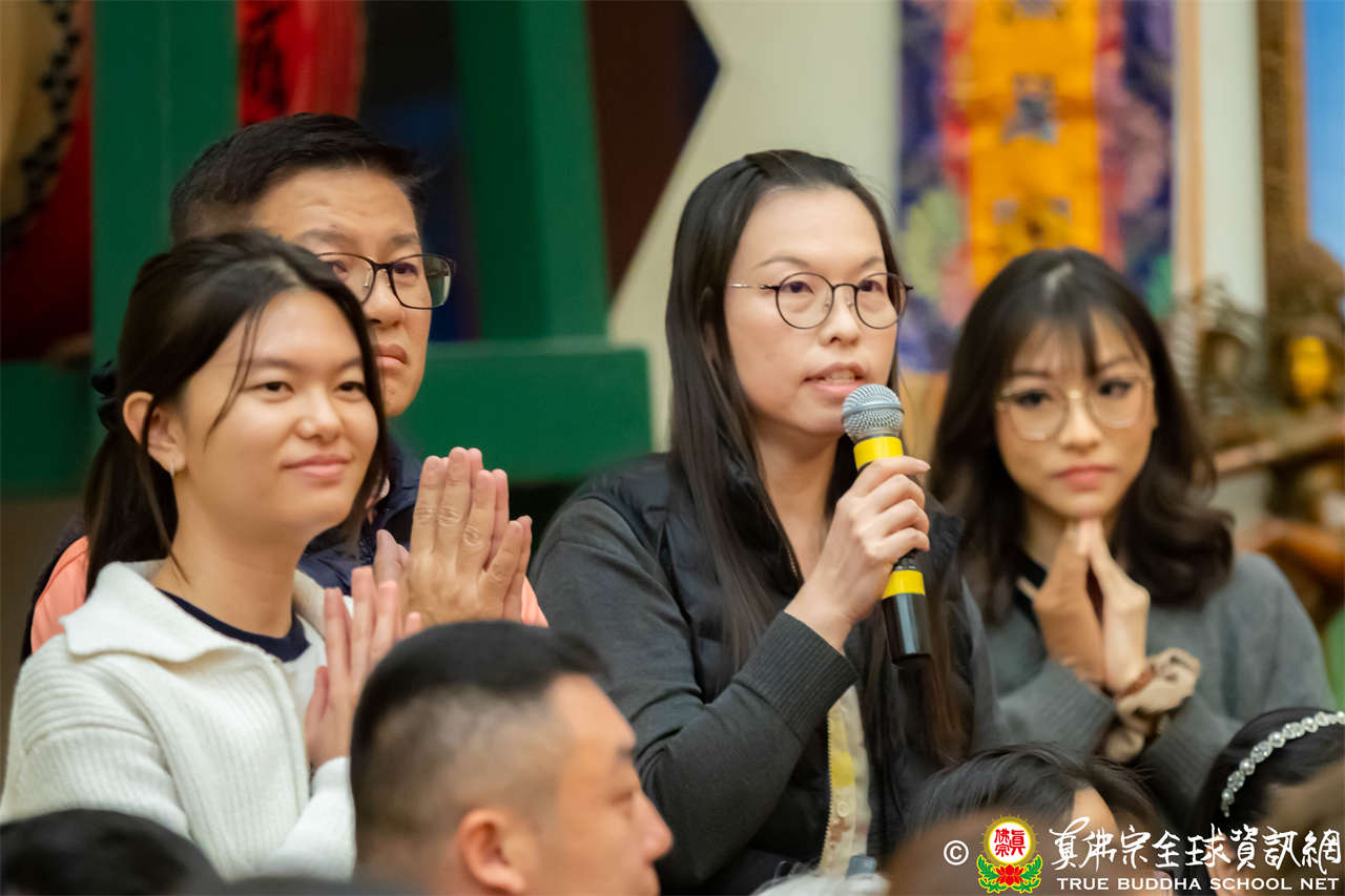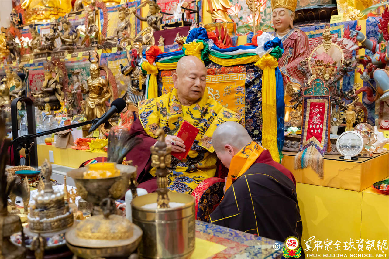 聖尊精闢寶貴的法語開示後,慈悲為新皈依弟子做皈依灌頂,然後加持大悲咒水,開光佛像,最後持佛麈一一加持與會大眾。