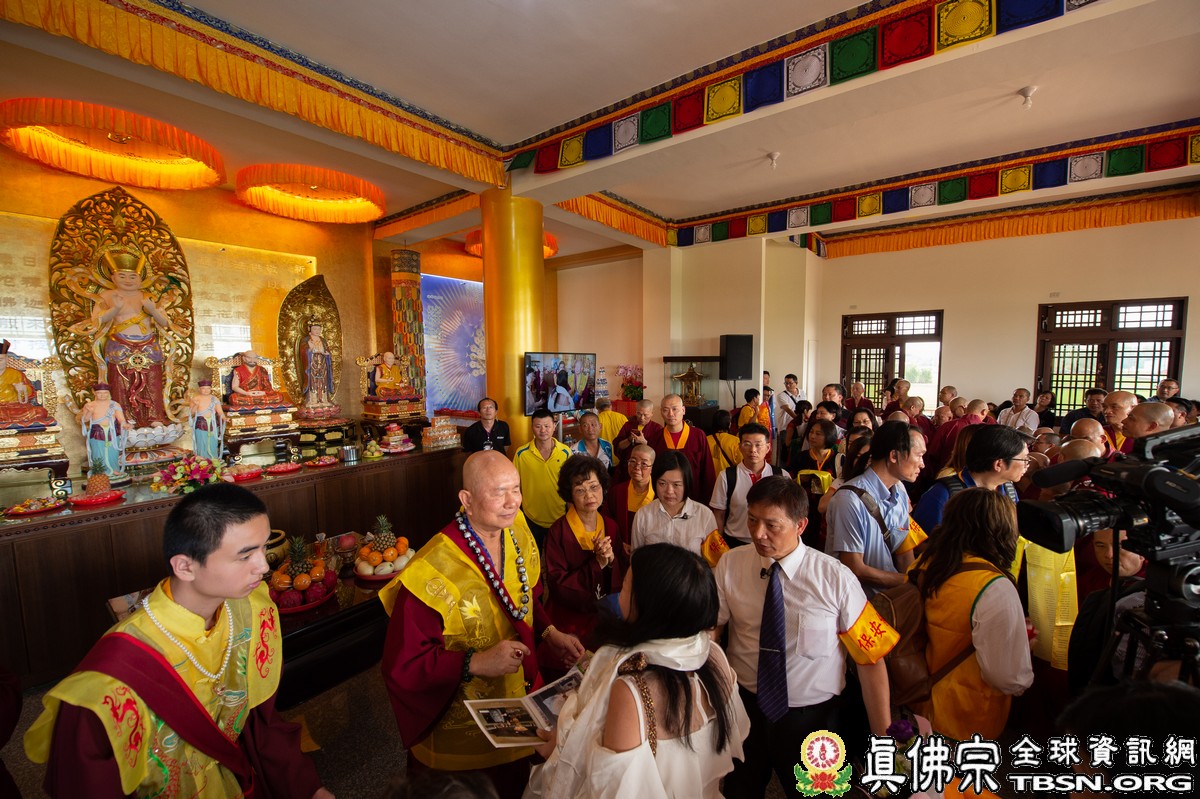 法王到達法記雷藏寺後,即為雷藏寺主持剪綵典禮及作灑淨結界,賜墨寶和慈悲接受600多位主祈者敬獻哈達,並替法記雷藏寺壇城開光。