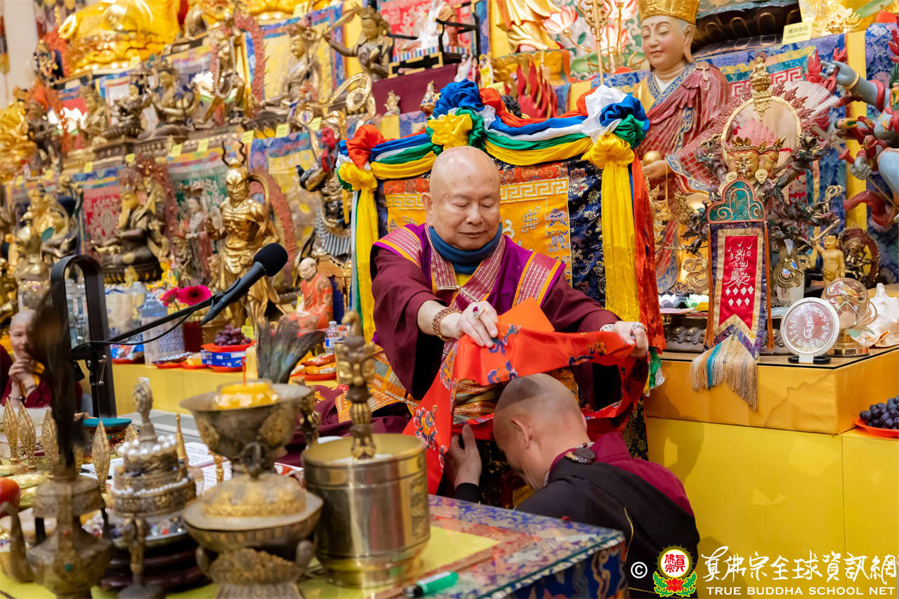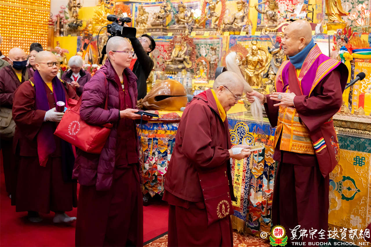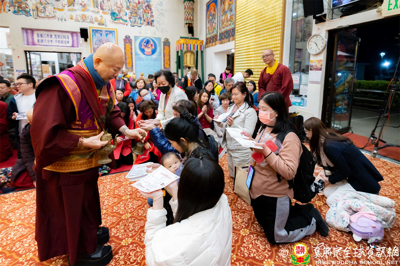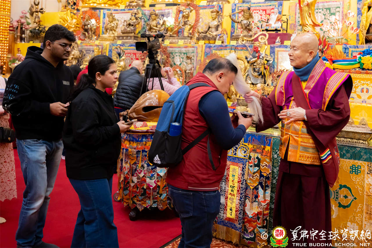 在講述楞嚴經後,聖尊為求皈依的信眾賜授皈依灌頂,加持大悲咒水及開光佛像,並以拂塵加持與會大眾。聖尊教導佛法真義,四眾弟子心開意解,法喜充滿,蓮華生大士的加持與顯現亦令與會眾等歡欣鼓舞,只要敬師重法、實修不懈,蓮師常在,佛光永照。