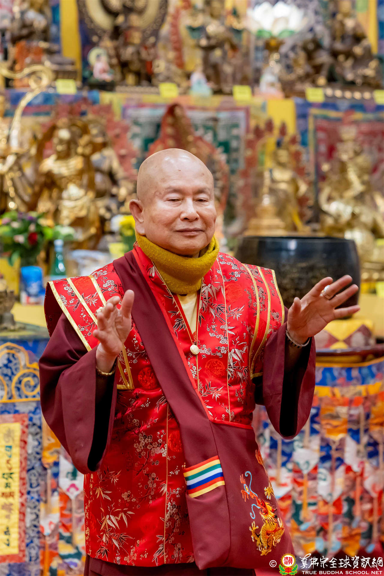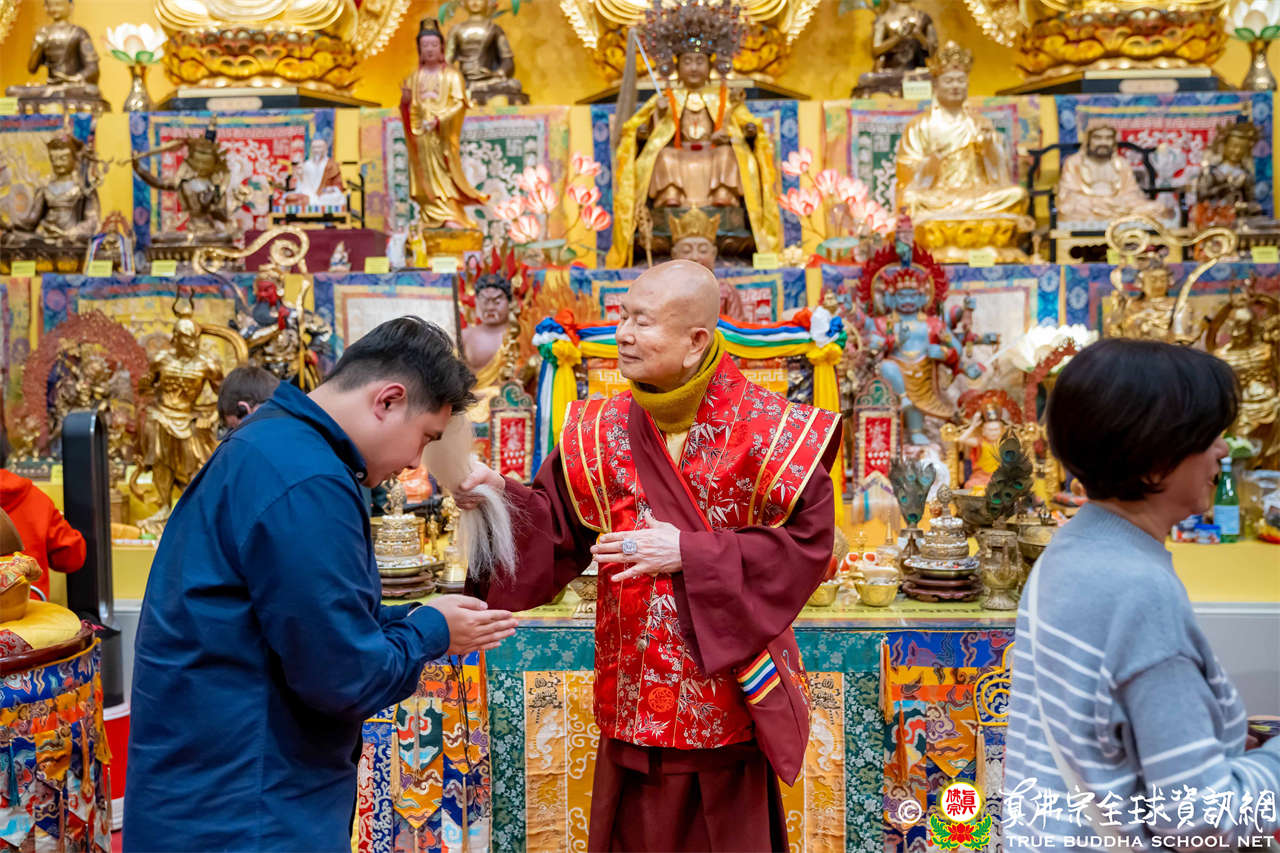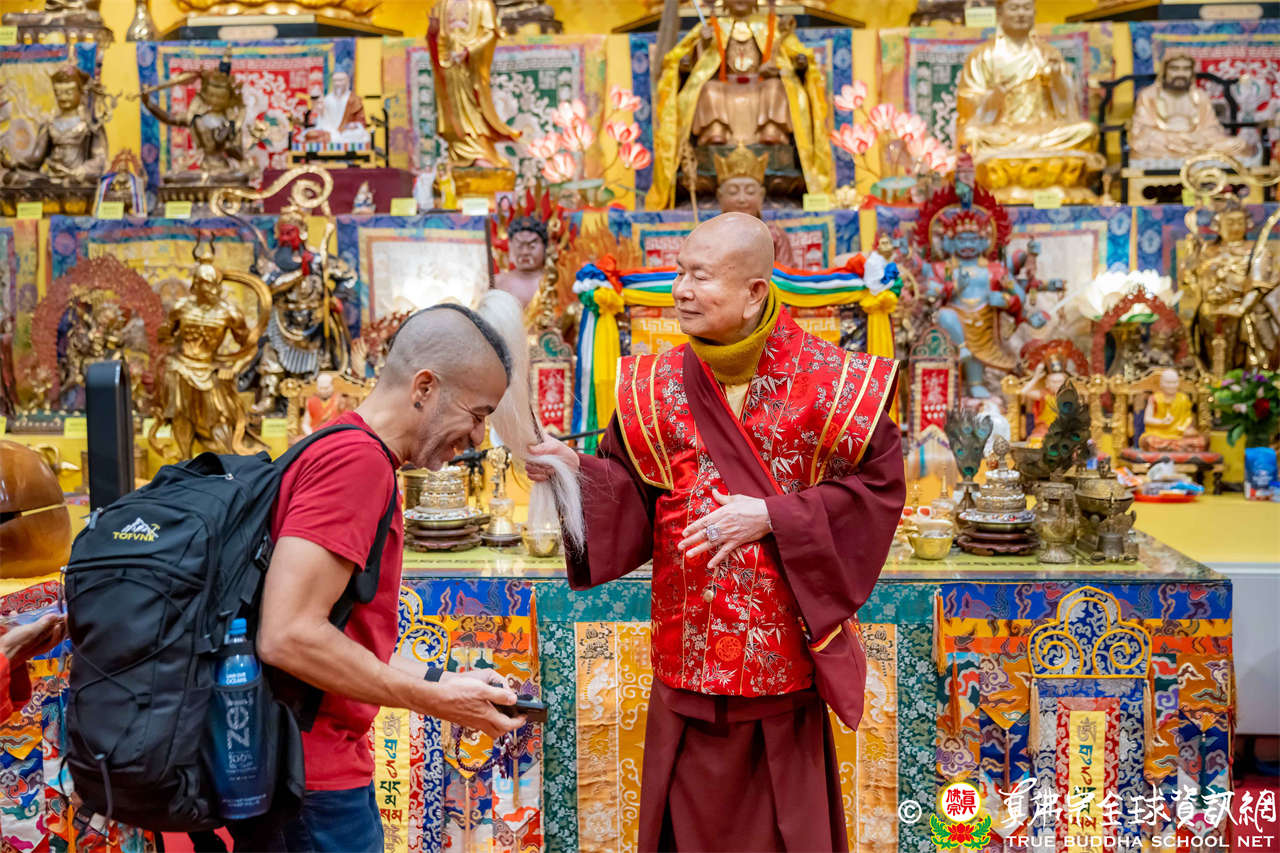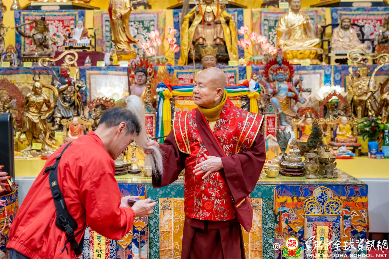在殊勝珍貴的法語開示之後,聖尊為新皈依者進行皈依灌頂,並開光佛像、加持大悲咒水、持拂塵加持與會大眾。感念聖尊慈悲不捨眾生,弘法度眾不辭辛勞,日日年年如此,祈願聖尊佛體康泰,吉祥如意,弟子眾等惕勵精進,自度度他,六度齊修,以圓成菩提。