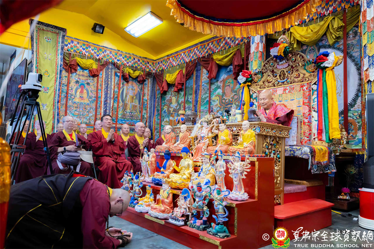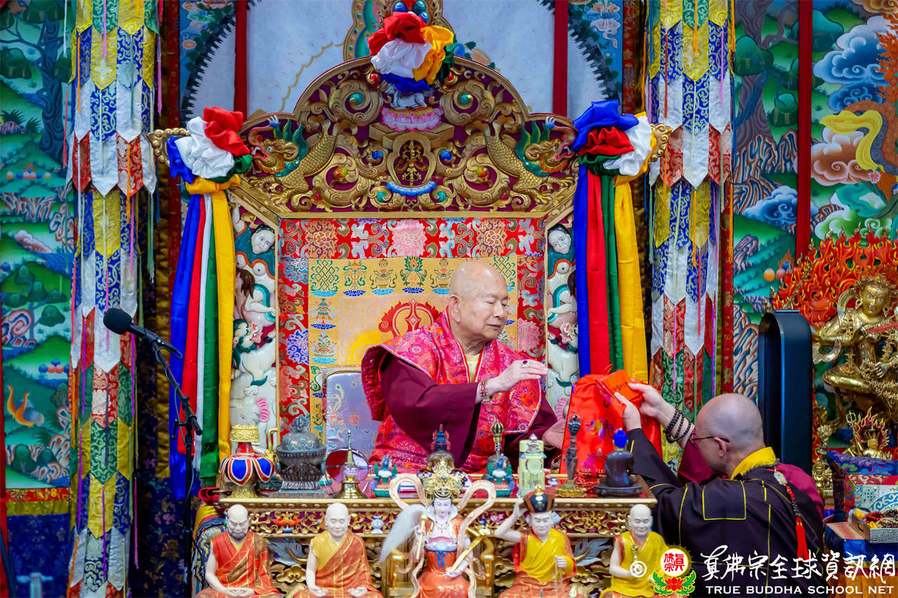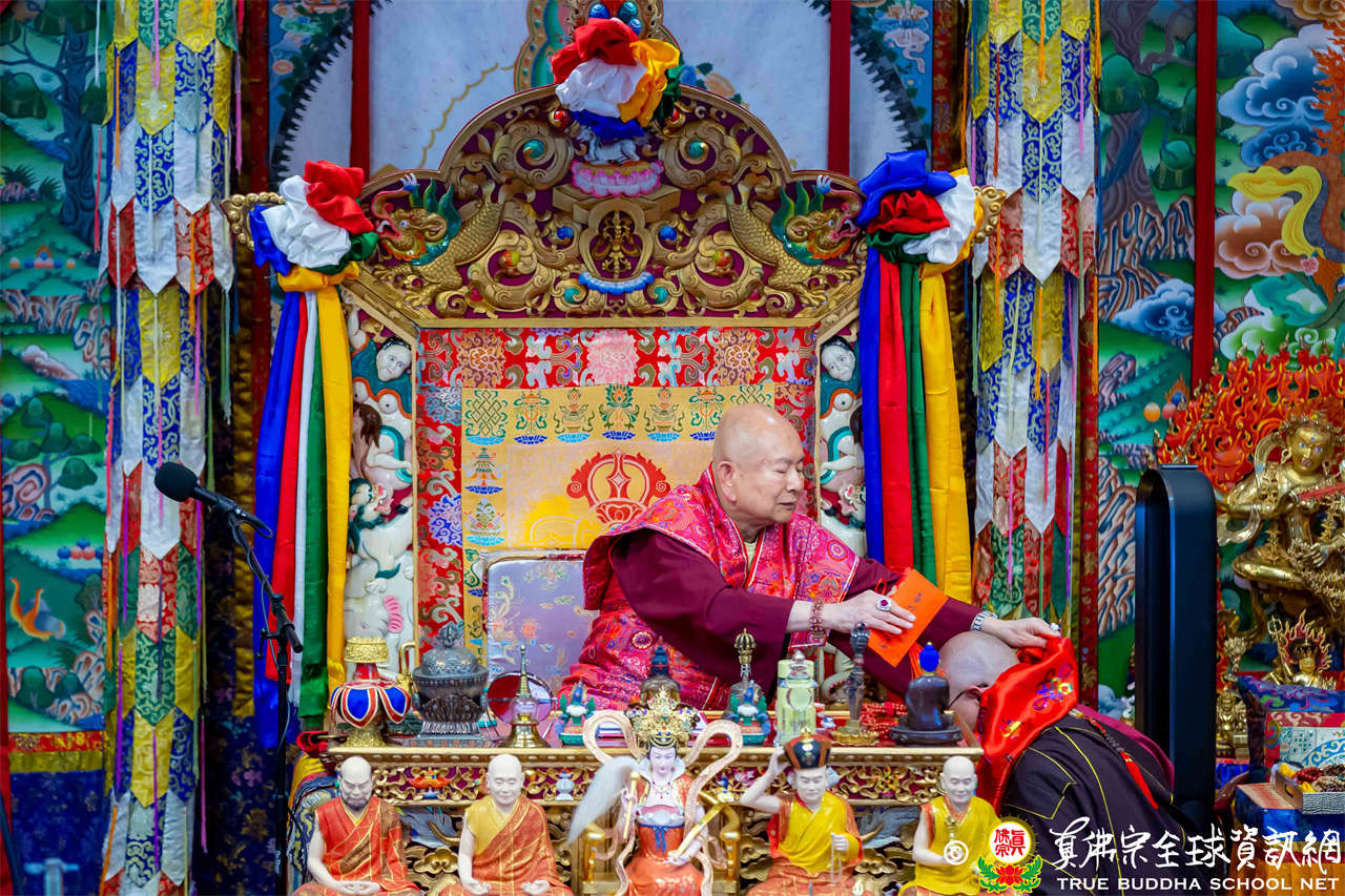 談及修持法門,法王引《無量壽經》指出,誦持長壽佛心咒能增福延壽,消除業障、遠離橫死與夭折,幫助修行者成就無死成就,往生極樂淨土。修持長壽佛可以消除疾病,福壽綿延,善緣增長,惡緣消除,令「世間法」的事業能夠長壽。