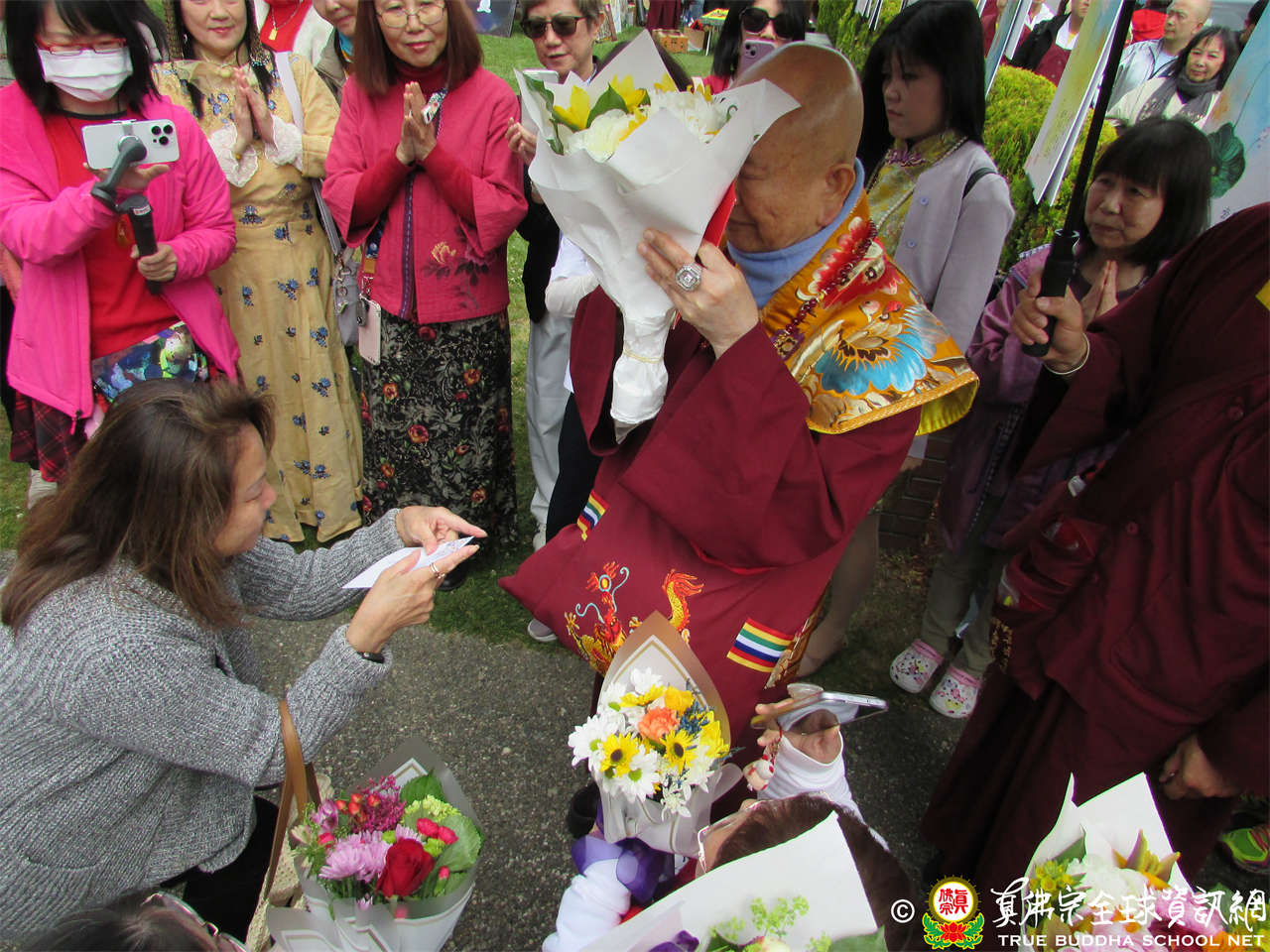 聖尊蓮生活佛走回真佛密苑的途中,不斷有同門獻花,祝賀聖尊生日快樂。