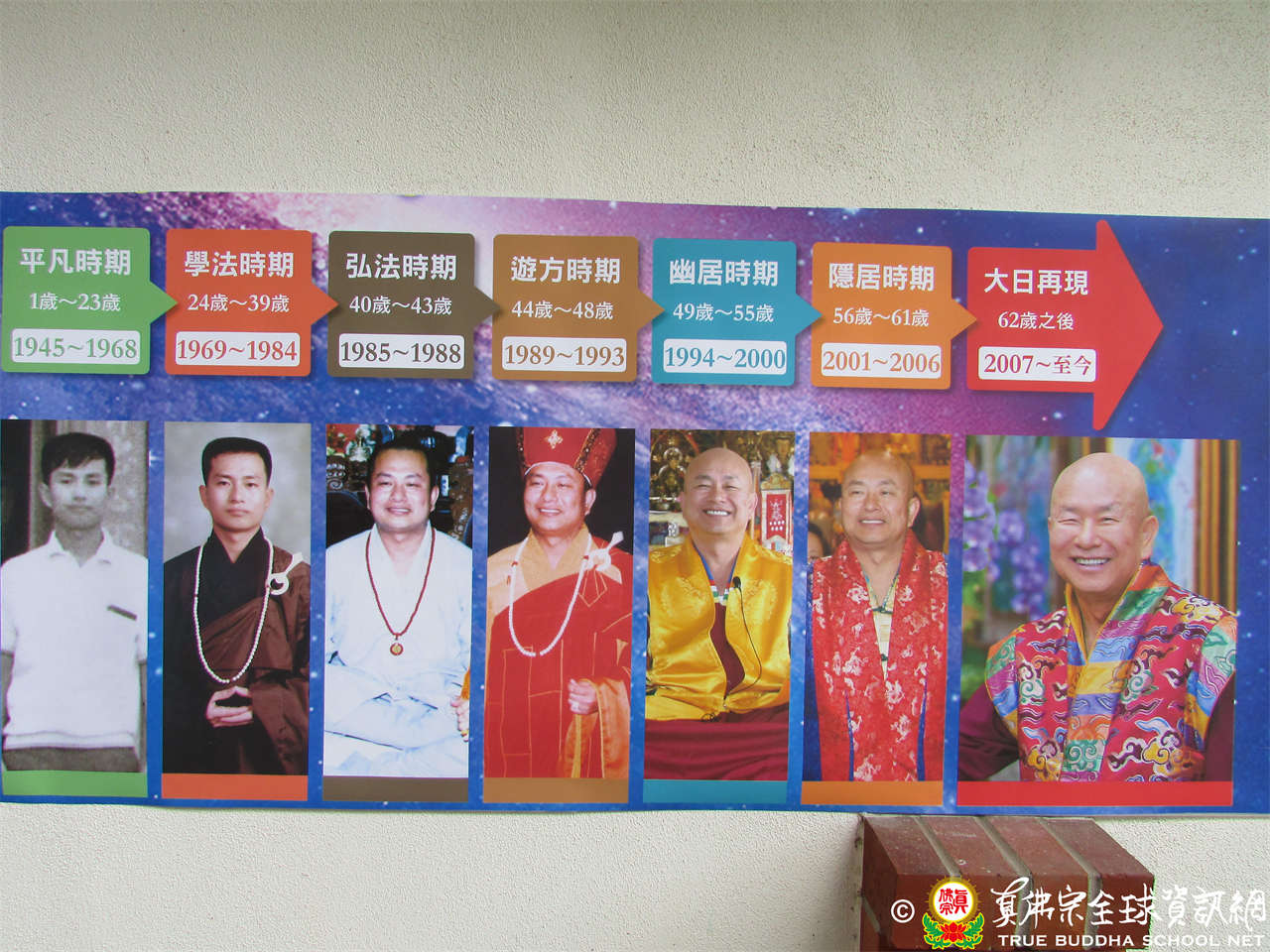 沿著西雅圖雷藏寺的外圍牆壁上,圖文並茂的展出聖尊蓮生活佛從小至今的時光縮影,歷經了平凡、學法、弘法、 遊方、幽居、隱居時期, 直至現在的大日再現。