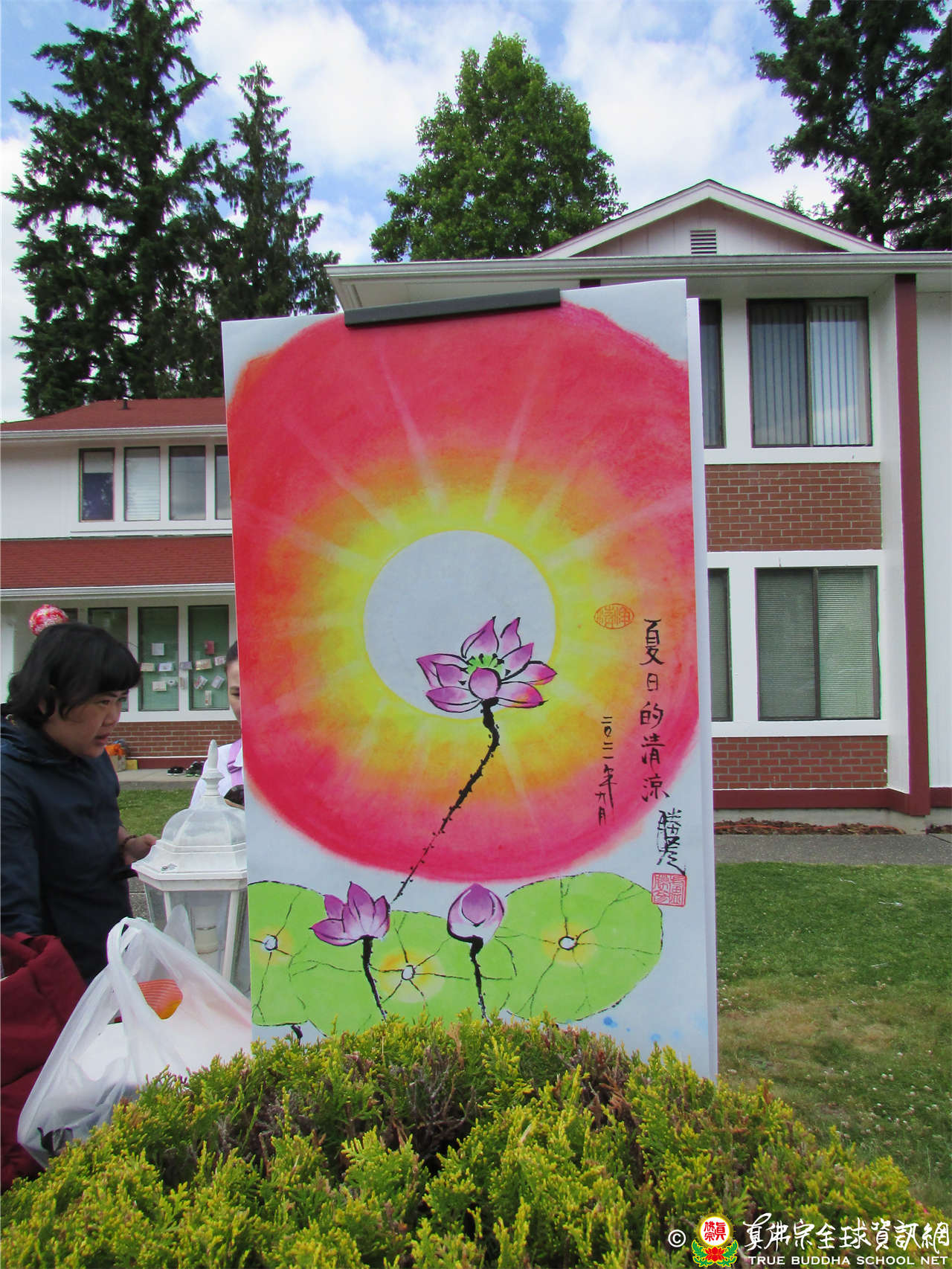 其中有一幅是大日中蓮花盛開的圖畫,聖尊題字為「夏日的清涼」,正好應了今天的天氣。因為之前好幾天都是非常酷熱,但今天天氣突然非常涼爽,約攝氏15度到20度之間,清風拂面,非常適宜遊客在露天的帳棚前參與活動。