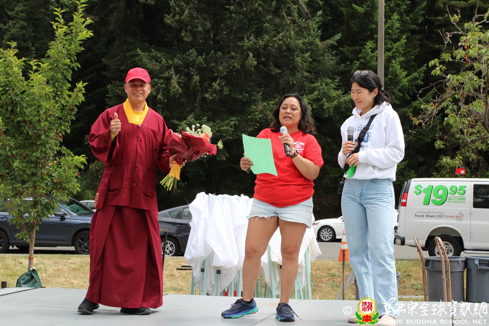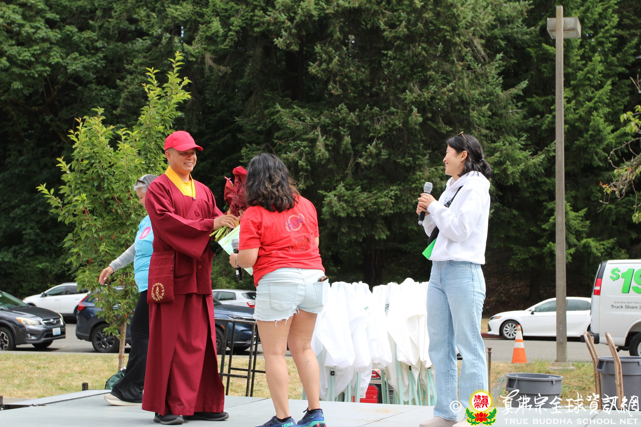 每一年為米而走的慈善活動,大家都是歡喜的樂捐贊助。西雅圖雷藏寺募得本屆活動中團體組金額最高的善款,主辦單位獻花給獲獎單位,由住持釋蓮吟上師代表祖廟上台接受表揚。