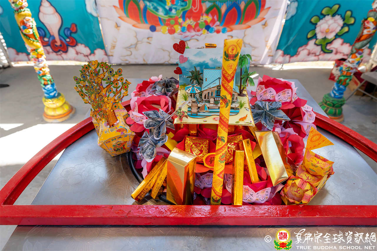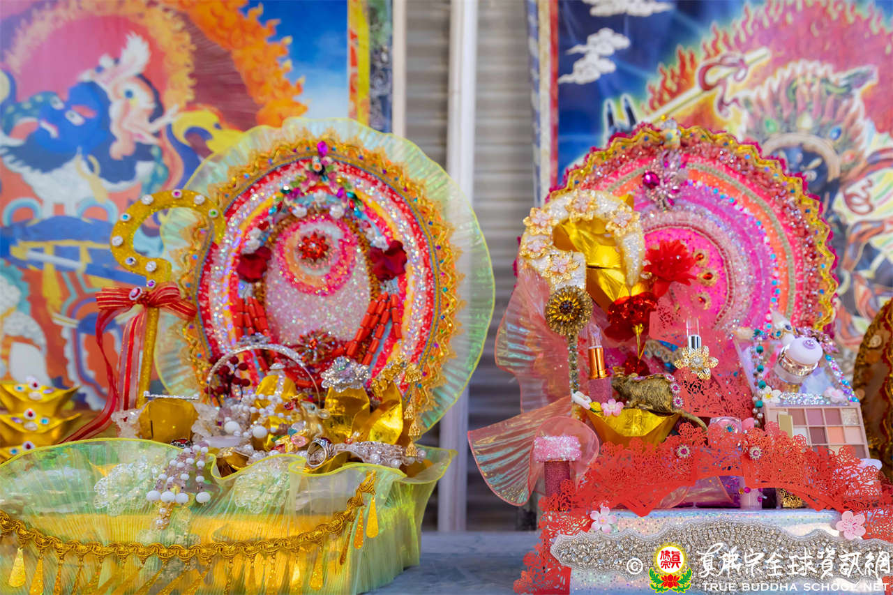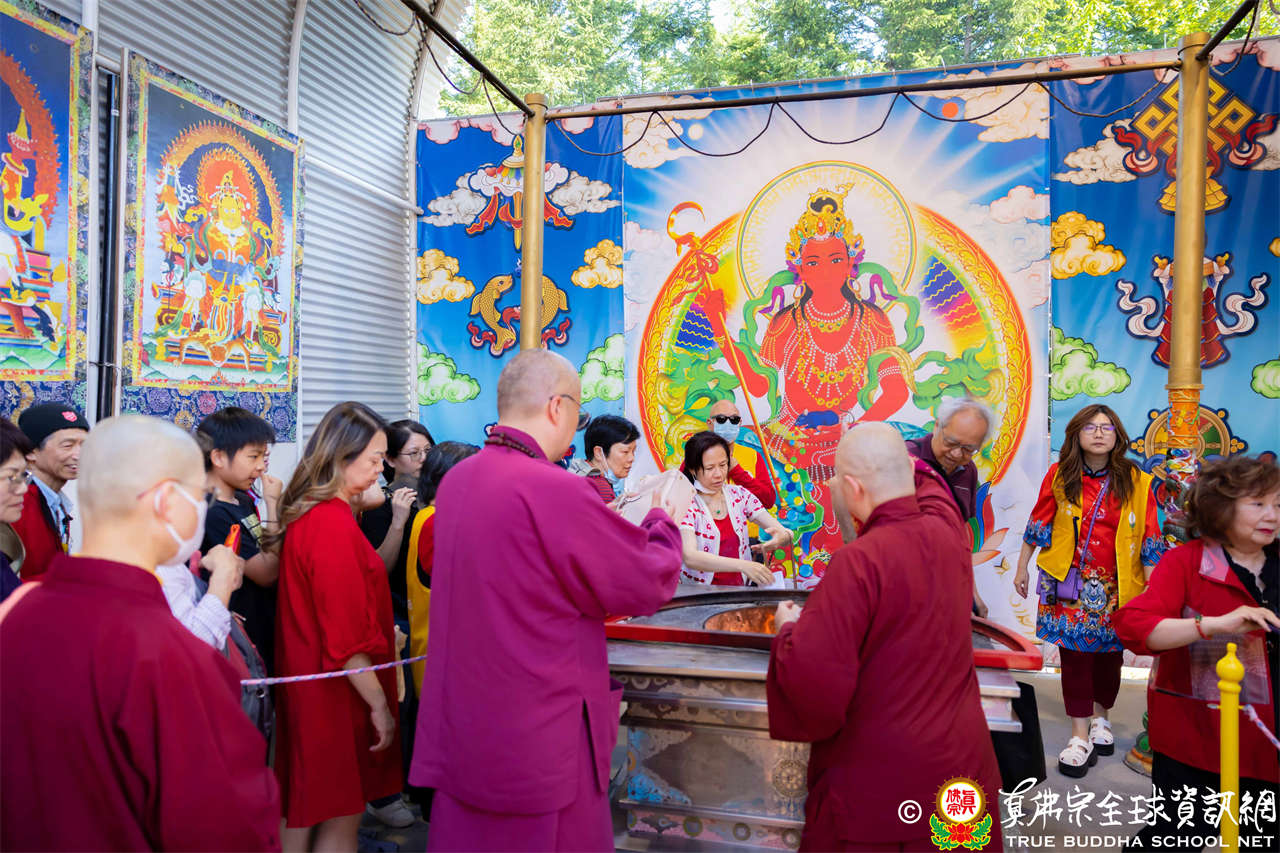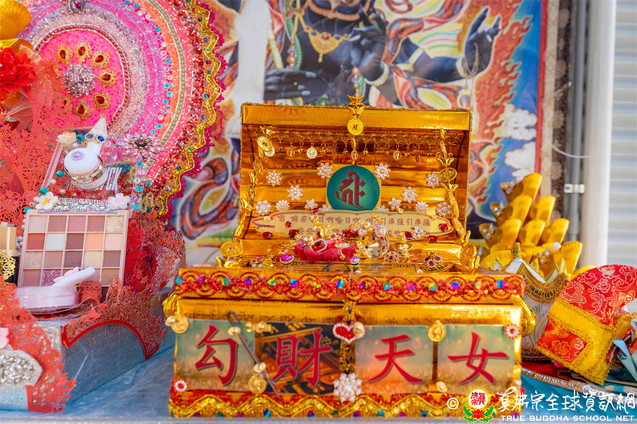 接著法王介紹此次法會主尊勾財天女,就是「勾攝財續母」,是阿彌陀佛心中所化,是西方極樂世界的財神。西方極樂世界的八功德水、七寶蓮池、黃金宮殿、七寶羅閣、七重欄楯、七重羅網、七重行樹,都是勾財天女引進來的。