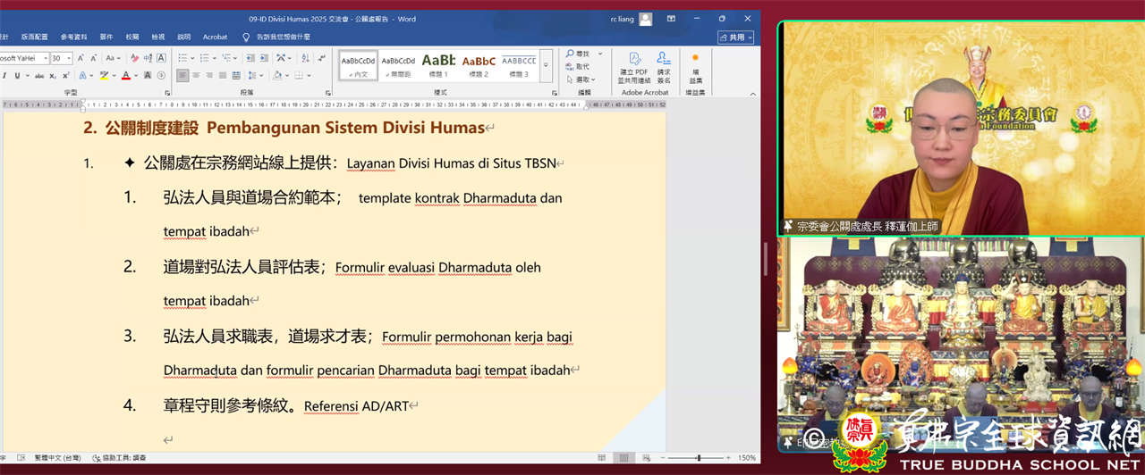 在互動交流環節中,來自印尼各道場的提問非常踴躍,內容涵蓋多元。宗委會各處長皆悉心回應,並將問答紀錄集結以中印雙語資料供全體道場參考,詳細內容請參閱真佛宗務網站\宗派資訊\公告,連結如下: https://truebuddhaschool.org/site/latestinfo?ref=AC_EJ3IOZ