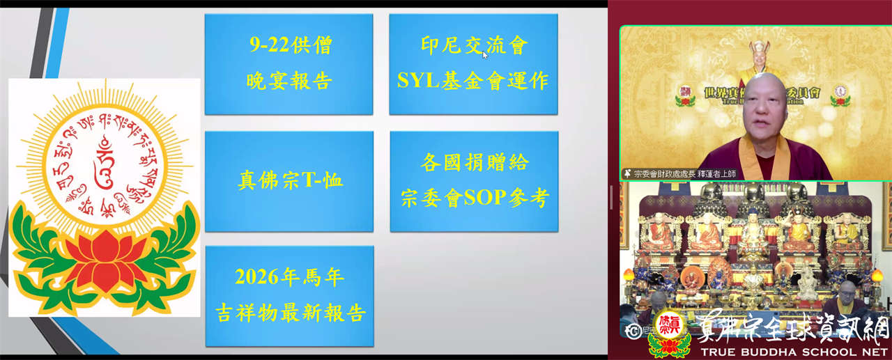 財政處處長釋蓮者上師報告,財政處目前是處於寒冷冬天,因為宗派有很多的開銷,需要大家支持。會中報告好消息,今年秋季法會期間將首度於西城舉辦供僧晚宴,並邀請根本上師蒞臨現場,歡迎大家共襄盛舉,供僧贊僧功德廣植無量福田。