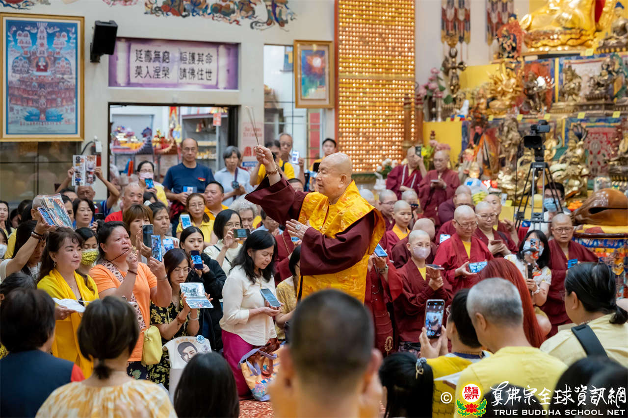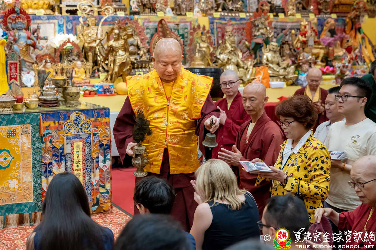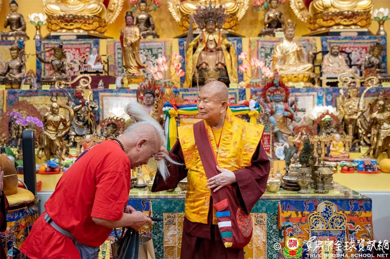 聖尊精彩絕倫的開示結束後,為新皈依者慈悲賜授皈依灌頂,加持大悲咒水,加持佛具部,開光佛像,並且為與會大眾以拂塵摩頂加持。