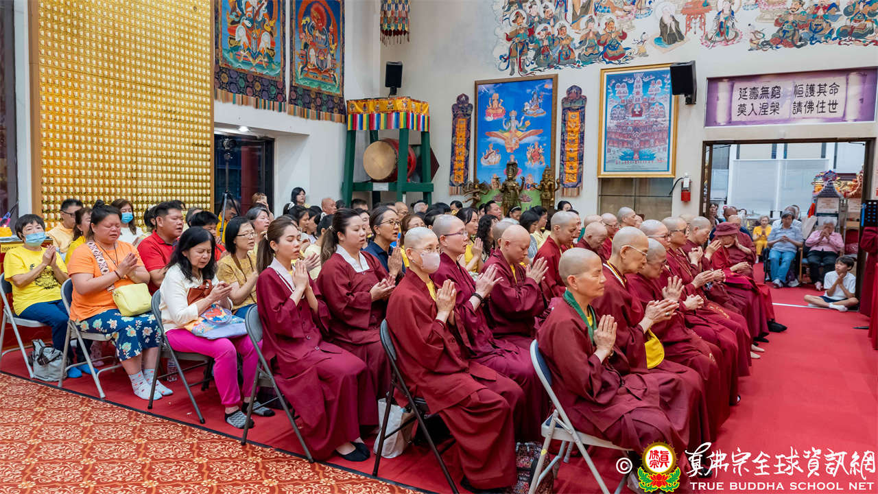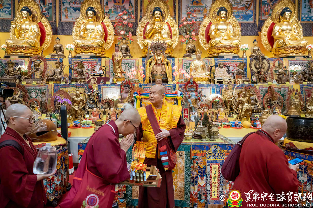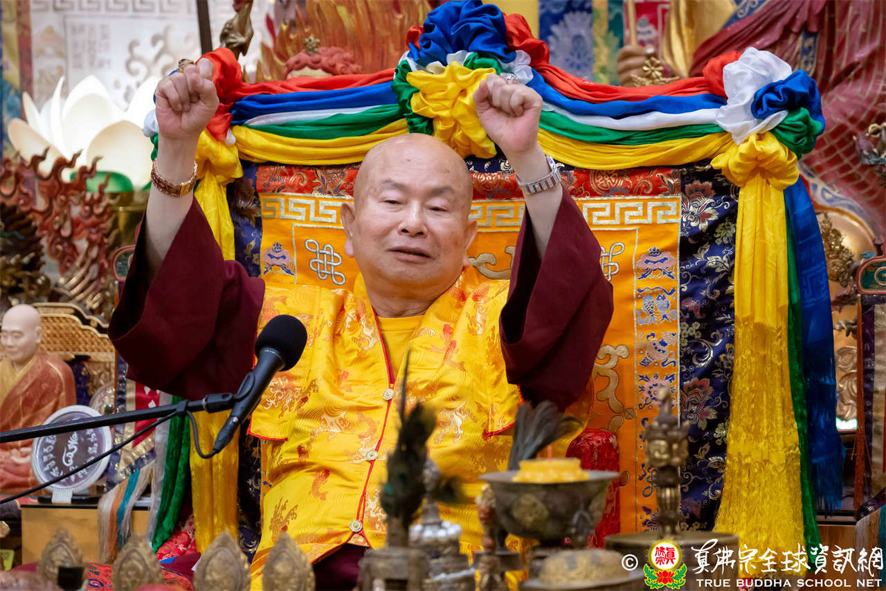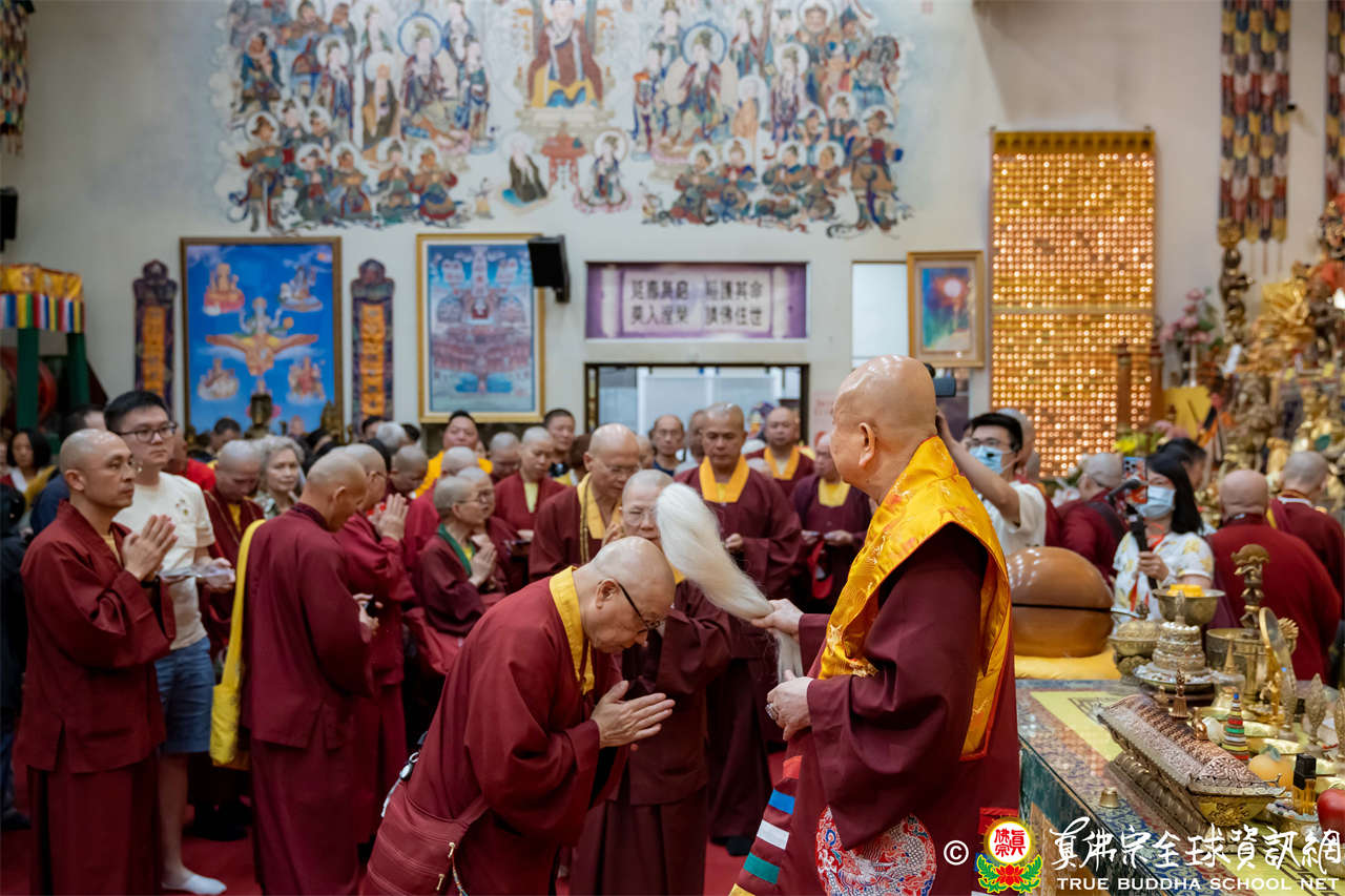 聖尊精彩絕倫的開示結束後,為新皈依者慈悲賜授皈依灌頂,加持大悲咒水,加持佛具部,開光佛像,並且為與會大眾以拂塵摩頂加持。