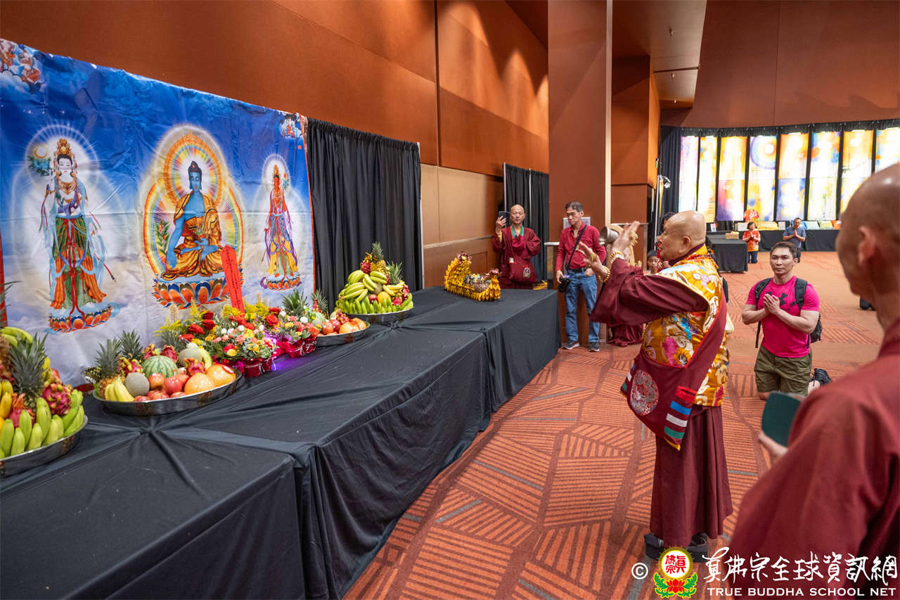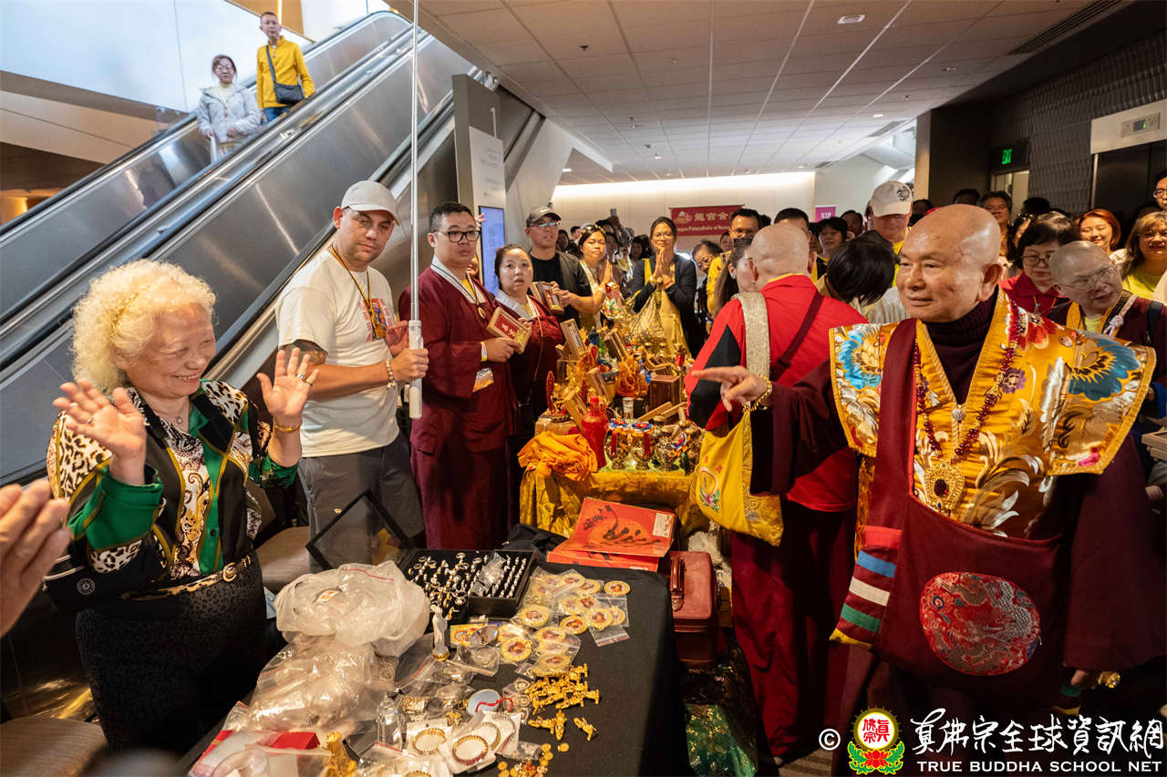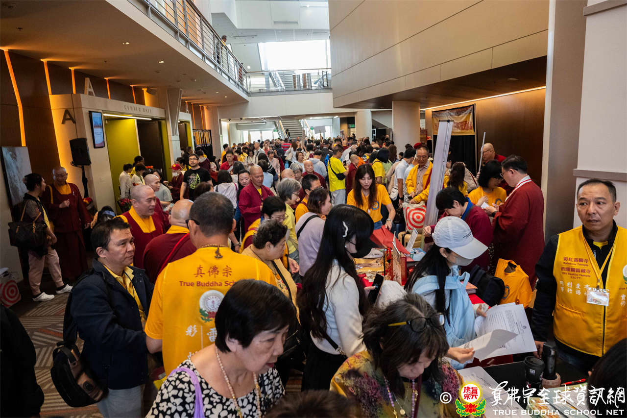 是日上午,自世界各地前來朝聖的弟子們歡喜相聚於會場,各攤位的佛具琳瑯滿目,吸引眾人圍觀選購,熱熱鬧鬧,人山人海,如同嘉年華會。