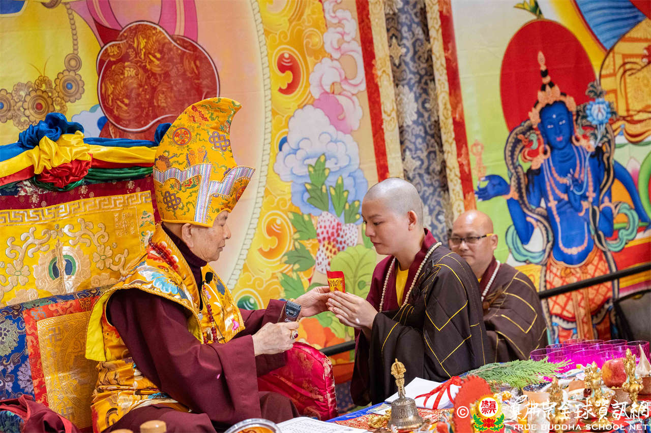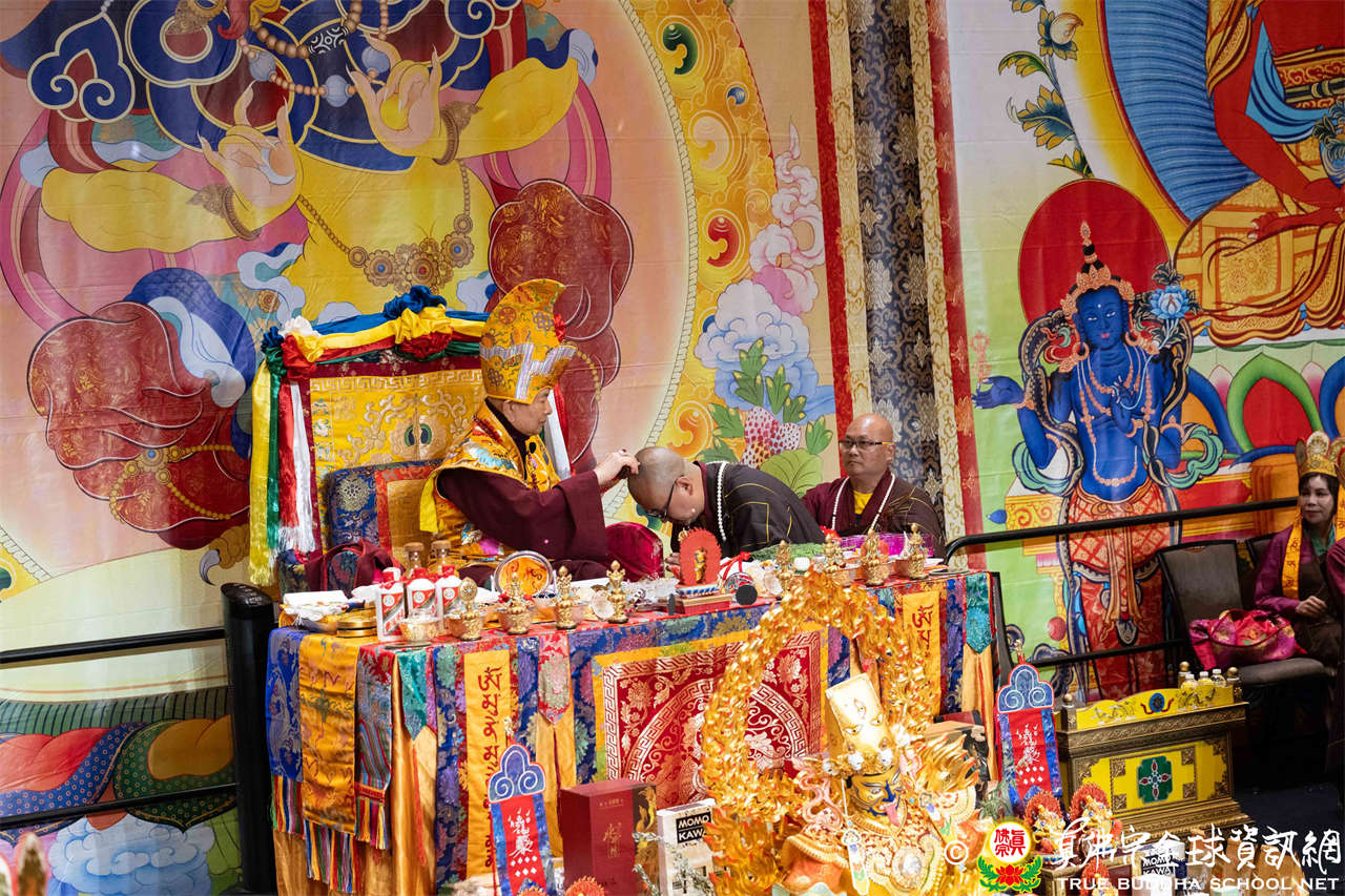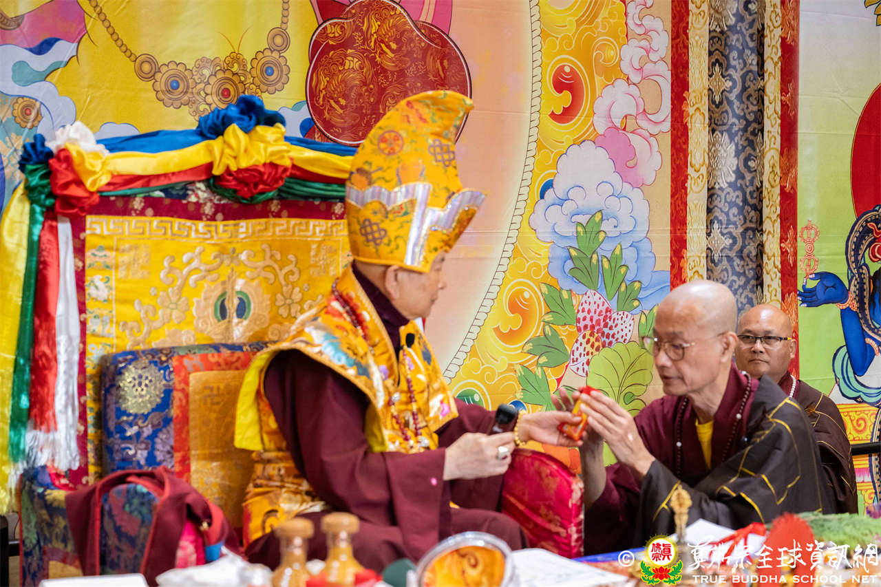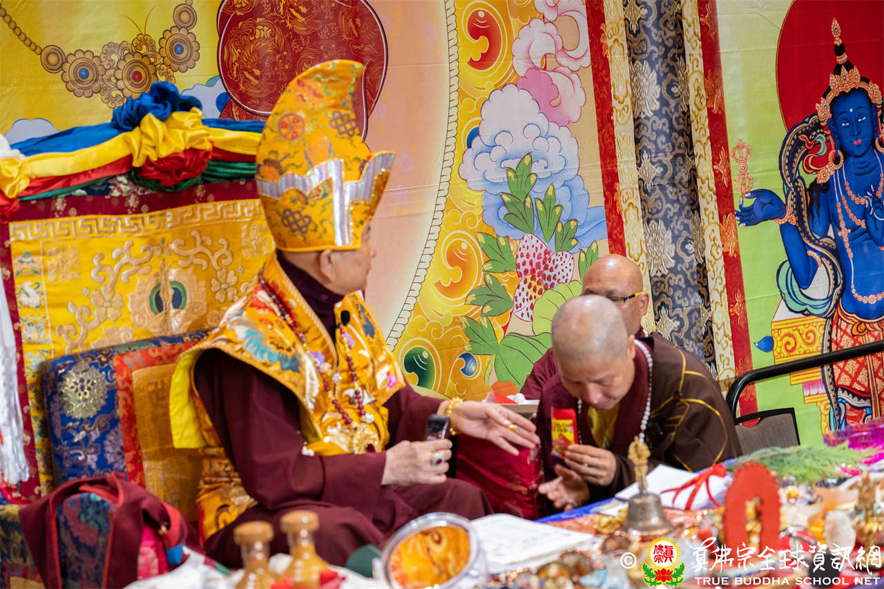 西雅圖雷藏寺住持釋蓮吟上師代表四眾向聖尊敬獻哈達,同時,與會眾等齊舉手中哈達以觀想敬獻於聖尊,秋季大法會開始進入阿彌陀佛密法的修持儀軌。