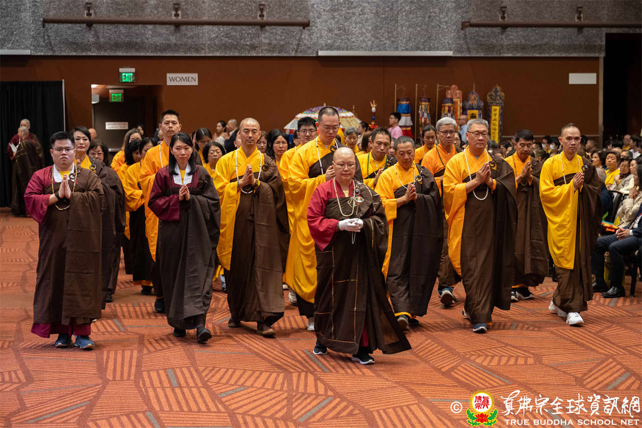 下午二時整,磬聲悠揚響起,四眾弟子虔誠合掌唱誦蓮花童子心咒,恭迎根本傳承上師聖尊蓮生活佛入壇場,眾等跟隨聖尊向佛菩薩與護法諸尊做大禮拜,法會正式揭開序幕。