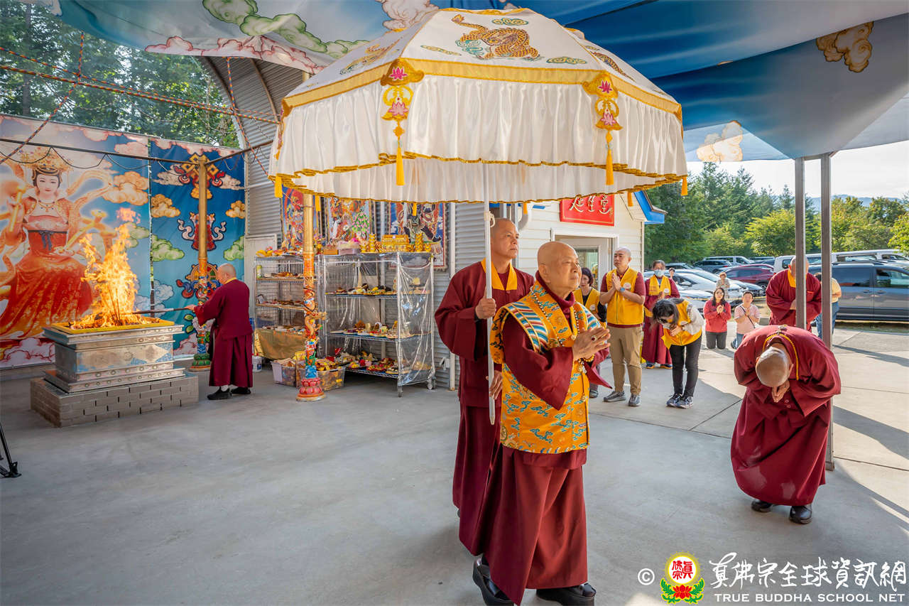 護摩圓滿後,法王首先預告,下週日(10月5日)將舉行「大白傘蓋佛母」護摩法會。此尊佛母在真佛宗中較少舉行,殊為難得。大白傘蓋佛母乃釋迦牟尼佛頂上光芒所化,當年於忉利天與阿修羅戰爭中,以傘蓋庇護諸天,展現大護法威力。法王講述佛母的形象後,也親誦其堅甲咒「吽 媽媽吽呢 梭哈」及心咒「嗡。沙爾哇。打他架打。烏尼卡施打。打把遮。吽呸。吽。媽媽。吽尼。梭哈。」。