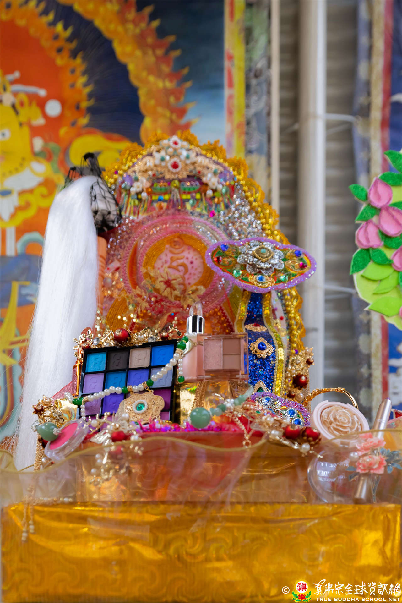 法王亦提到,家中供奉的諸多金母聖像,包括千手千眼觀音、珍寶金母、黑面金母、變身金母等,數量繁多。每日早晚,祂都向諸金母行禮致意,宛如親密家人般共處。法王笑言每天晚上都要跟祂們說晚安,早上要說早安,中午還要打招呼。