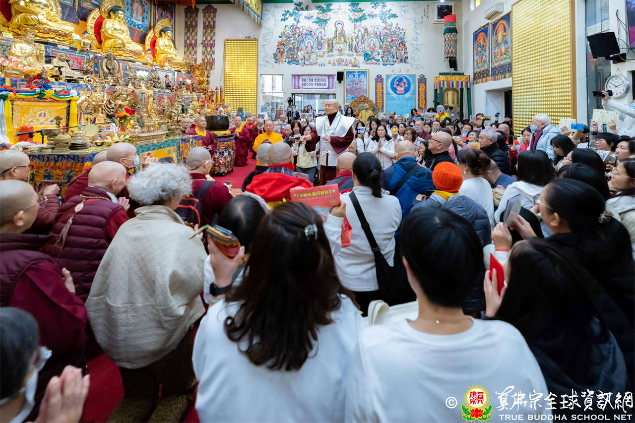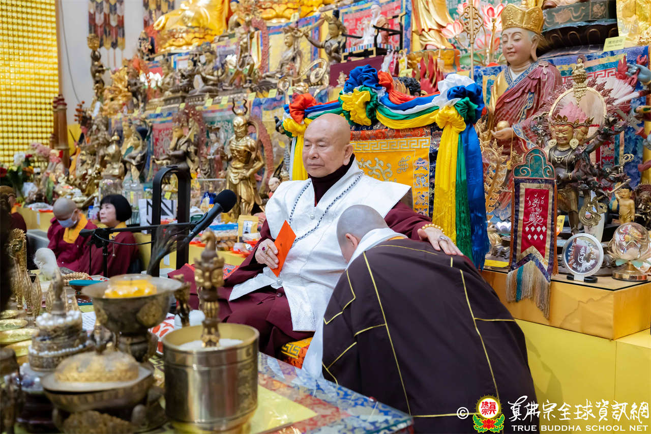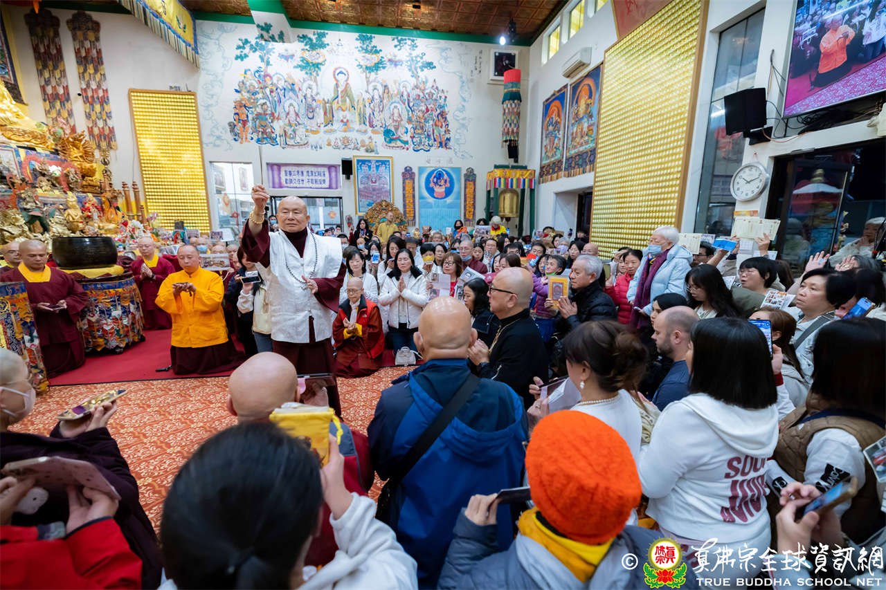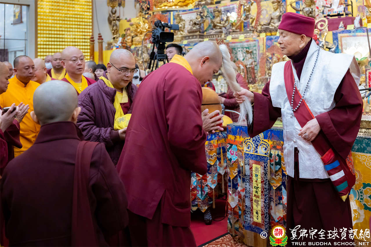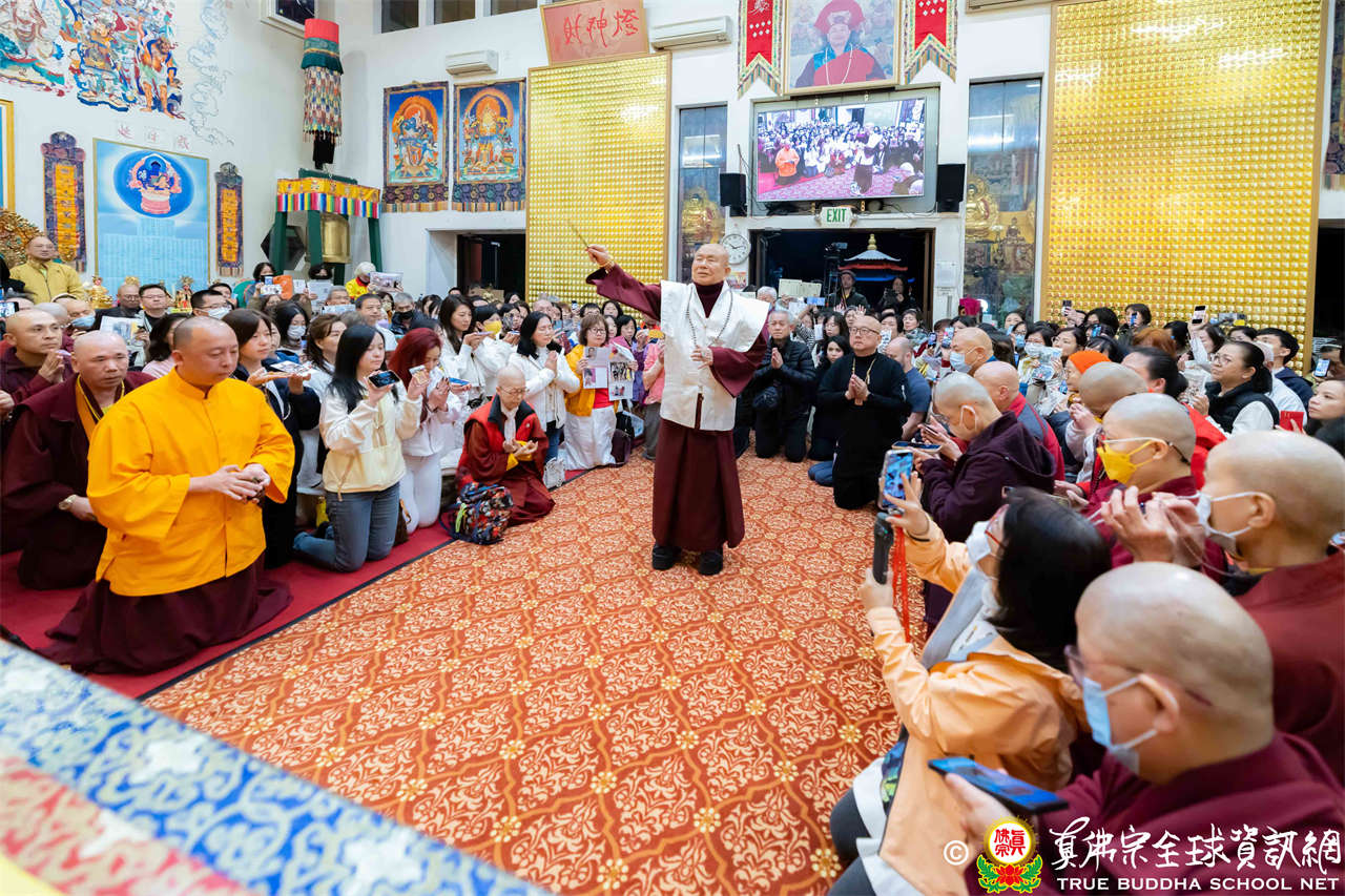 精彩的寶貴開示後,聖尊慈悲加持大悲咒水、開光佛像,並為新皈依弟子做皈依灌頂,然後手持拂塵,一一加持與會大眾。