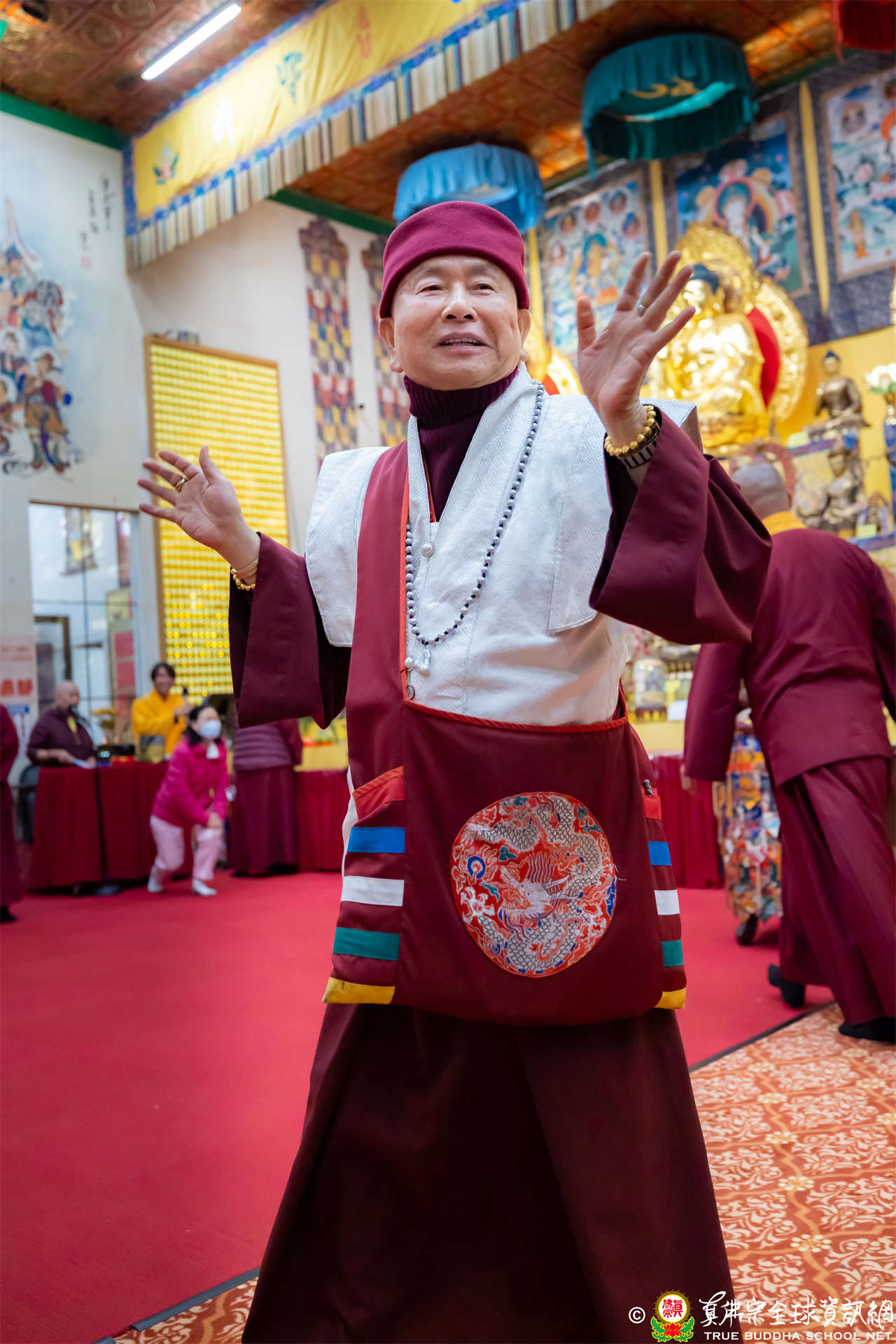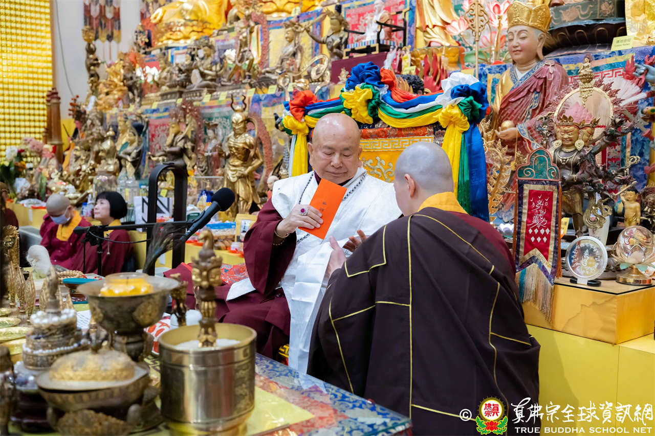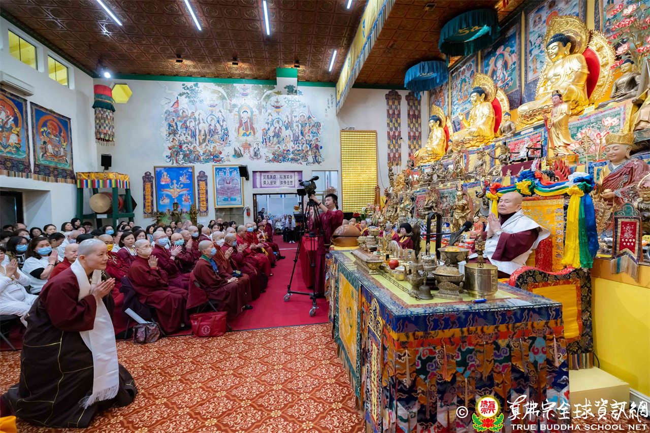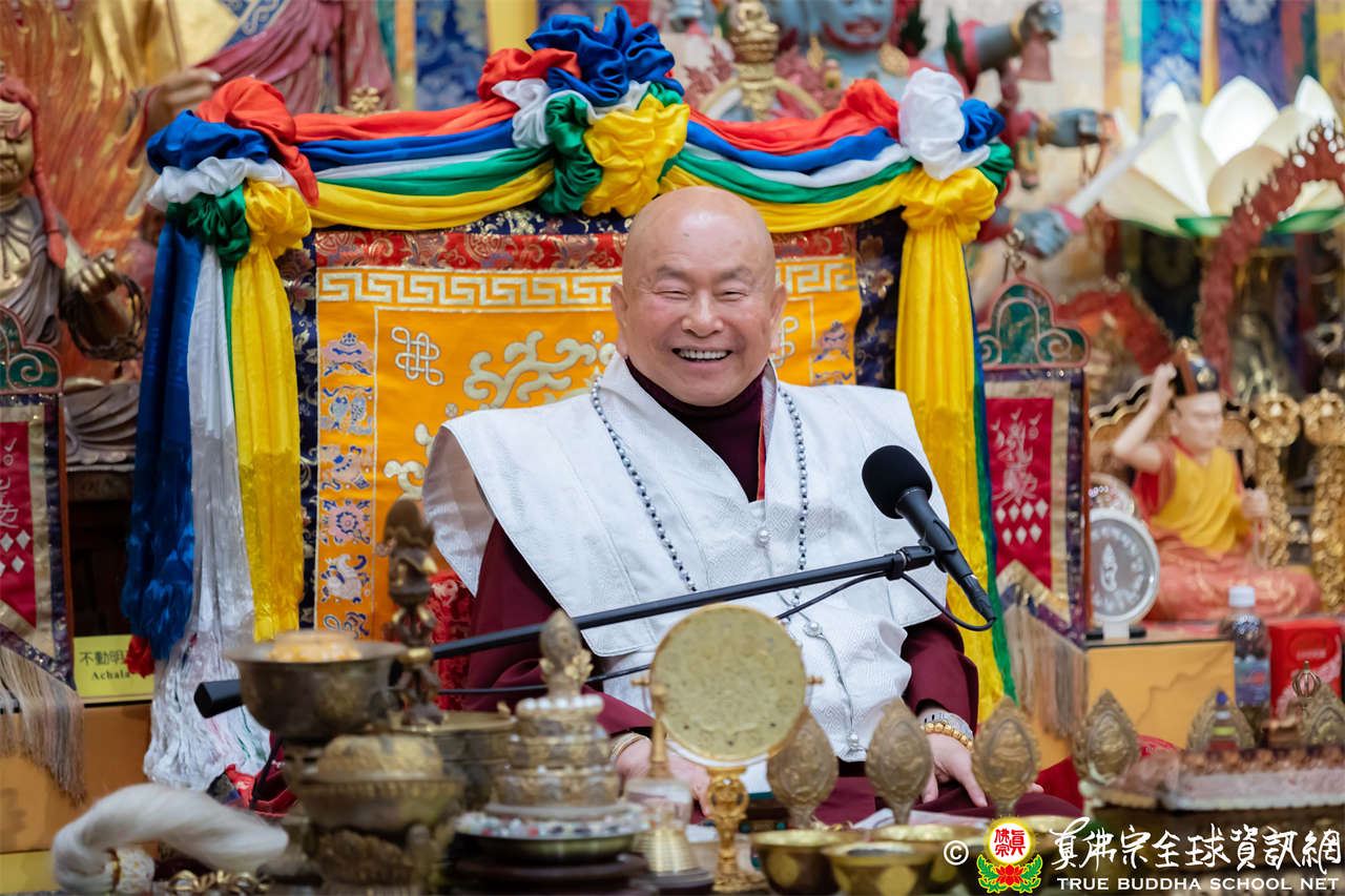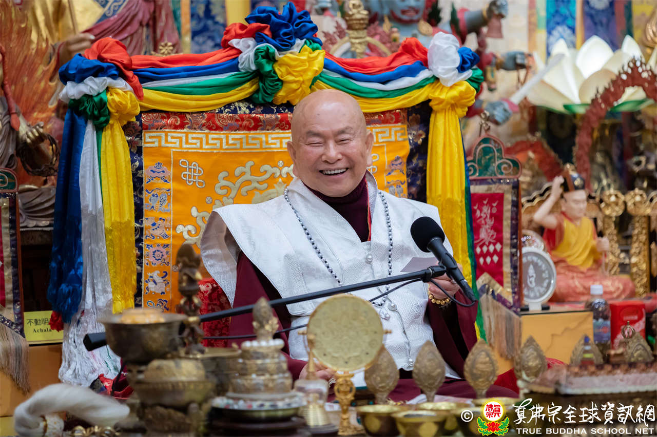 精彩的寶貴開示後,聖尊慈悲加持大悲咒水、開光佛像,並為新皈依弟子做皈依灌頂,然後手持拂塵,一一加持與會大眾。