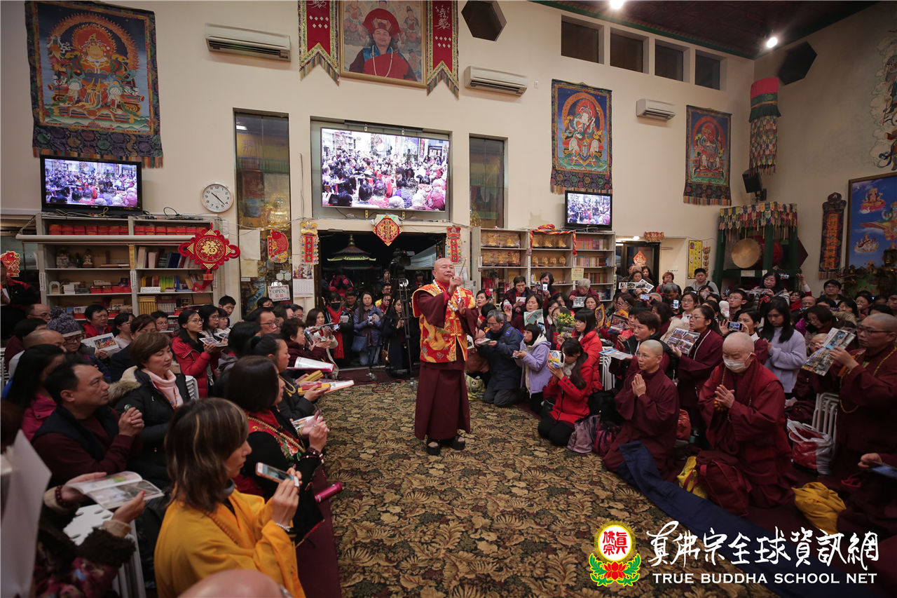 2020年1月25日周六正是大年初一,西雅圖雷藏寺顯得熱鬧非凡,許多從外地來的同門特别來和師尊蓮生活佛一同過春節,如巴西、新加坡、馬來西亞、加拿大、廣東、香港、台灣、加州、印尼等等,弟子們和師尊齊聚一堂,倍感幸福!晚上八時同修蓮華生大士本尊法,人人專注唸誦經咒,同修完畢,師尊給大家拜年,祝福大家身體健康,精神愉快,修行得到力量,各各得成就。