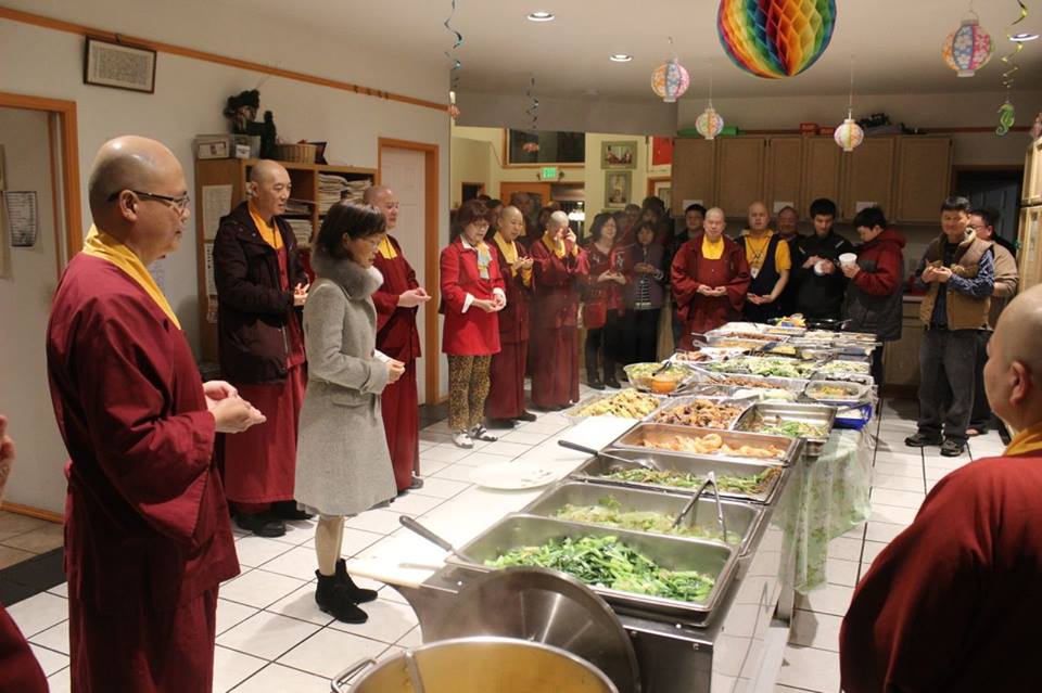 傍晚時西雅圖雷藏寺大飯店開始熱鬧起來,雷藏寺準備的美味餐點和大家帶來的佳餚擺滿了大長桌, 令人垂涎欲滴,用餐時刻到了,眾上師法師陸續進來與同門互相問候,最特別的是今年:師母蓮香上師也出席參加感恩餐會,眾人一陣熱烈的歡呼聲後, 開始享用美饌。