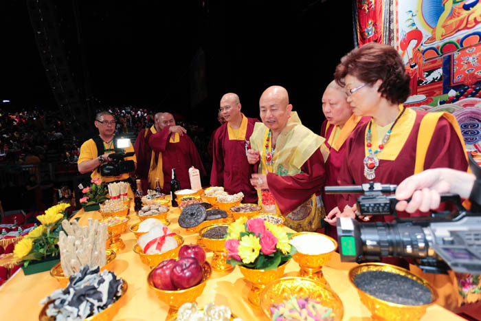 下午四時許,蓮生法王和師母蓮香金剛上師在眾人的陪同下,親臨法會舉辦場地--香港大嶼山亞洲國際博覽館1號展館,進行巡視。展館內外,四眾佛子早已聚集等候迎接。蓮生法王在檢視場地的音效,燈光之後,便幽默地用簡單的廣東話和大家致意問好,更在離開之前一一為在場的眾弟子摩頂加持,令在場的弟子們無不激動萬分。有不少遠道而來的弟子更是第一次面見師佛,很多人對此次能有如此的福份,形容自己激動的心情難以平靜,表示再遠的路途也值得參加。