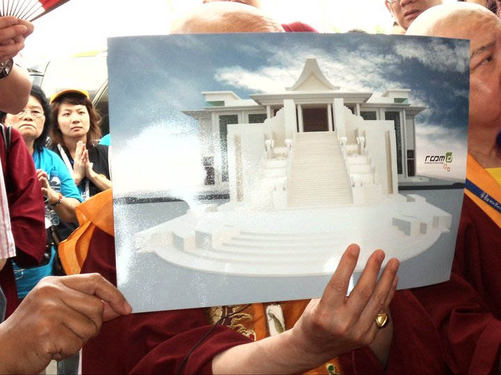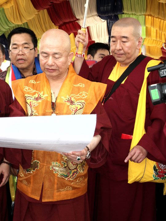 主辦單位ㄧ開始迎請蓮生活佛入帳篷內,活佛向壇城上香祝禱後,靈算指示:此地理甚佳,分數高達90分。需沿著圍牆方向而建寺。