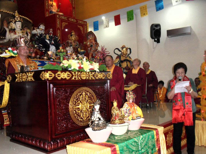 活佛首先賜墨寶給棉蘭雷藏寺與蘇北雷藏寺。之後活佛被迎請大殿,加持開光後理事長蓮花明珠致歡迎詞,蓮惺教授師則講述:大殿主尊當初大過大門,移不進來安座,後來焚香祝禱唸上師心咒,竟奇蹟似的可以移進來。棉蘭雷藏寺主尊蓮花童子高達約七米,是本宗道場最高金身之冠。