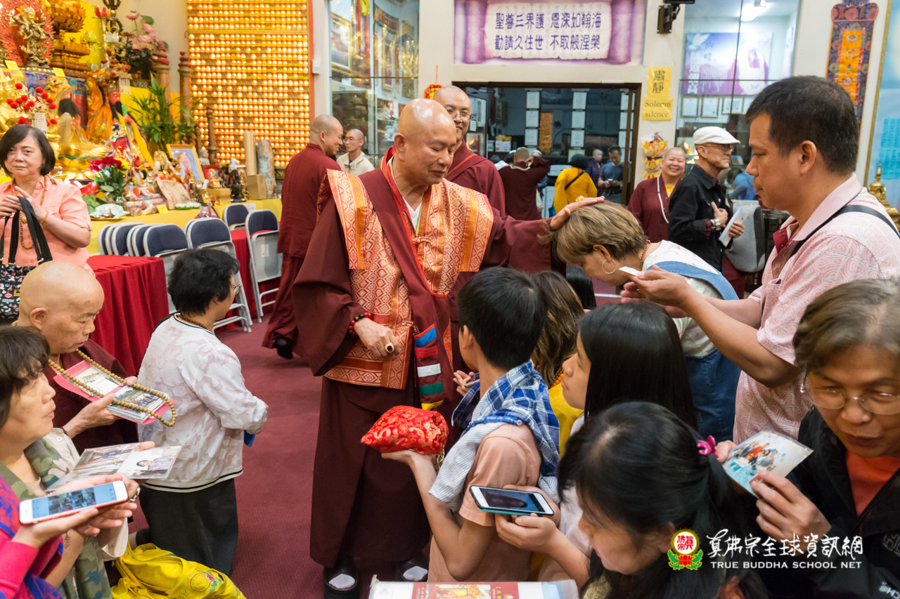 會後,聖尊為大眾賜授皈依灌頂、加持大悲咒水及開光佛像。離廟前,聖尊為與會善信一一摩頂加持。今晚聖尊的開示,身為弟子深刻感受到,對根本上師的恭敬和淨信俱足,是修行的首要根本,弟子們無論是白天黑夜,對於根本上師,都要能日間頂戴、夜裡住心。