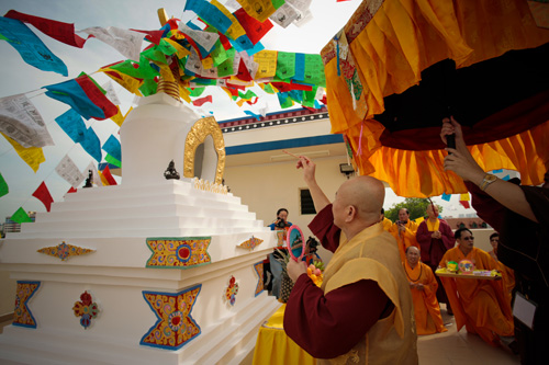 2008年12月12日早上,聖尊應弟子的邀請來到了雷藏寺(新加坡),早在清晨七時之前,已經有風聞而來的弟子在守候。聖尊佛駕時,路上已經擠滿了弟子,熱鬧非凡。首先,聖尊為雷藏寺進行揭匾儀式,在一陣陣的「發啦!」之聲中,進入雷藏寺為時輪金剛殿及佛具部開光加持、為地藏殿開光,然後到頂樓為尊勝塔開光。接下來到休息室看看,聖尊看到了幾幅早期師尊的畫,笑言不像美女。聖尊在圖書館(真佛報分社),賜下一幅鎮寺墨寶,最後終於來到大殿,為壇城及佛具開光、上香、頂禮。雷藏寺特別挑選了歷年來默默無餘地付出的「最佳義工」何廉欽師兄敬獻哈達給聖尊、最佳義工蓮花寶和師姐獻花給師母。