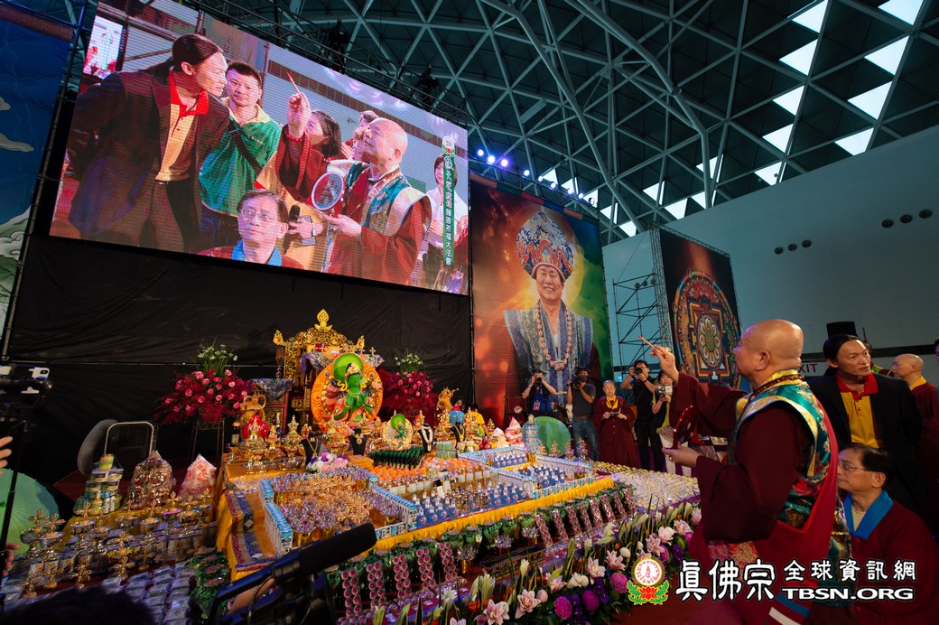 早在上午9點,四眾弟子便紛紛湧入會場。師尊、師母於10:50分抵達高雄展覽館,先加持了法會壇城、延生位、往生位及現場攤位,並持咒測試現場的音響設備;根本上師更自掏腰包,贊助了真佛般若藏和大義學會,如此實際的大賜福,令現場信眾無不感動。中午時分,功德主紛紛向師佛敬獻哈達,祈求救天災度母大悲心的加持,圓滿每一個善願。接著師尊接受了中天、民視等媒體的採訪;師佛講到自己與高雄的淵源,對此處有很深的眷戀,今日傳「救天災度母」法,就是要消除這片土地和台灣地、水、火、風的災難,真佛宗更熱心公益,「大義學會」為體恤打火兄弟的危險辛勞,特捐贈總價約台幣50萬的RIT(快速救援小組)救援包7組給高雄市政府消防局,黃江祥局長也回贈感謝狀,眾人皆期許「大義雷藏寺」速在高雄市矗立;記者們也問及現任高雄市長韓國瑜和蓮生法王的因緣,原來去年4月8日在高雄國際會議中心的「綠度母」傳法大法會,當時尚未成為市長候選人的國民黨高雄市黨部主委韓國瑜,就在法會上向蓮生活佛敬獻哈達,師尊感應到綠度母、二十一度母和咕嚕咕咧佛母給了他很大的加持,韓國瑜亦是相當努力與親民,能體恤百姓疾苦,自然俱足當選的善緣。