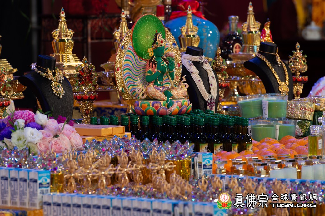 「救天災度母大法會」正式開始。會場銀幕播放著精緻的救天災度母三段法生觀想畫面,讓人人自然而然地在念頭中升起莊嚴法相,救天災度母心咒:「嗡。達咧。都達咧。都咧。媽媽沙爾哇。耶耶嘛哈。哈那巴雅。新登木。咕嚕。梭哈。」的優美咒音中,根本上師演化息災、增益、祈福、敬愛、超度大手印,清淨的法流灌頂著每位與會者!迴向時,蓮生法王祈請救天災度母接引幽冥眾往生佛國;消除大眾的業障、疾病、災難、煩惱和意外,人人福慧增長、敬愛圓滿、所求如願、修行得力、光明熾盛、心靈提升、果位增上;護佑這一片大地吉祥如意!