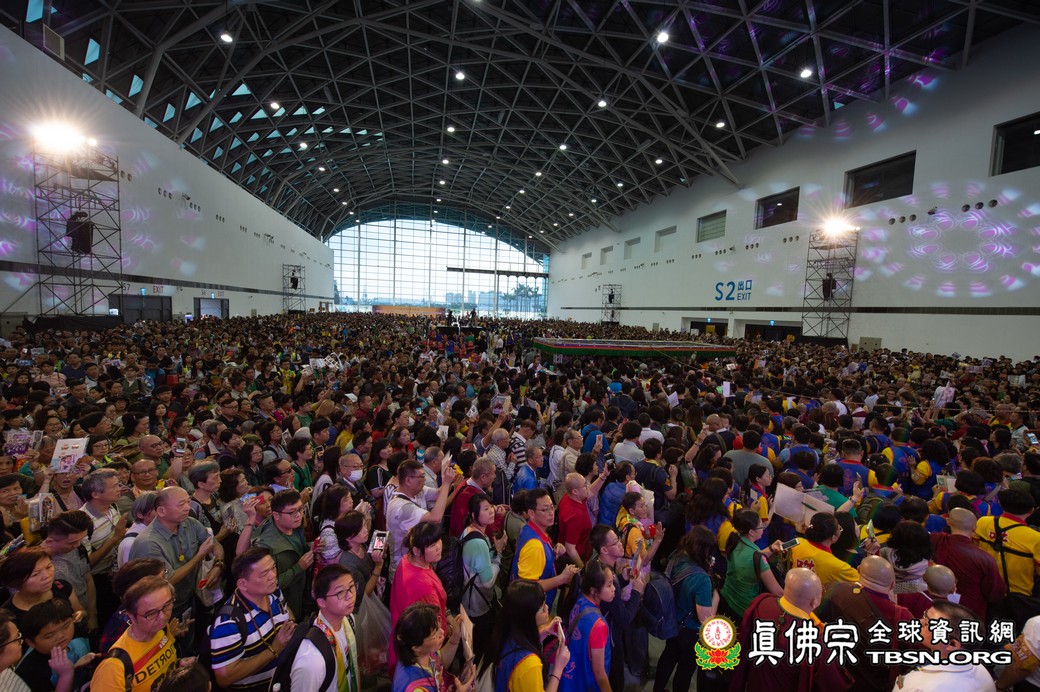 下午兩點,迎師組與上師團恭迎根本上師蓮生法王高昇法王座,主壇「救天災度母傳法大法會」。現場逾萬名善信與各界名流齊聚,將高雄展覽館偌大的會場擠得水洩不通。法會開始前,多位貴賓上台致詞;高雄市長韓國瑜偕同幕僚蒞臨,韓市長並上台致詞,他從事政治活動,絕不能忽略黎民百姓所遇的艱難,要時時保持一顆謙虛的心,有感於「世間苦人多」,感恩師尊主持這場佛教盛會,讓世人無比浮動的心能寧靜下來,遠離顛倒夢想,讓台灣社會和高雄,更和諧及美好。「高雄小金剛」許智傑立委講到和師尊結緣五六年,學到了歡喜做和歡喜心,便能一輩子快樂幸福。黃昭順立委也感謝師佛的基金會協助全球災後重建,八八風災後,更在高雄建橋、協助弱勢兒童,並讚嘆這場盛大的「救天災度母護國祈福大法會」,能讓台灣、高雄遠離災厄,風調雨順、國泰民安。