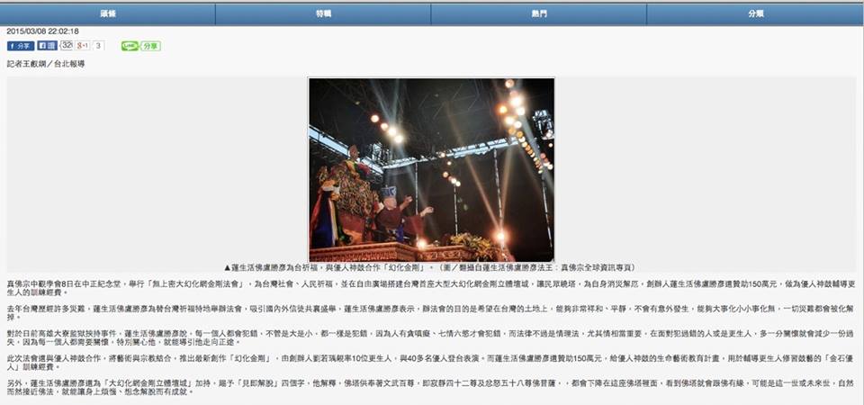TBSN在此次蓮生活佛所傳的「阿達爾瑪佛」、「大幻化網金剛」兩場大法會,TBSN新聞組成功的由蓮店上師領軍,能夠以最快速的,即時的將師尊傳法訊息在「TBSN真佛宗全球資訊網 FB」及「TBSN真佛宗全球資訊官方網站」即時po出,甚至還有宗外網路媒體NOW NEWS文字記者引用「TBSN真佛宗官網的照片」,並為真佛宗全球資訊網作了免費的宣傳!也讓全世界無法參加師尊這兩場大法會的同門善信,透過網路,可以即時收看到師尊最珍貴的傳法盛況!(NOW NEWS照片如附圖) NOW NEWS的網頁:http://nownews.com/n/2015/03/08/1625568