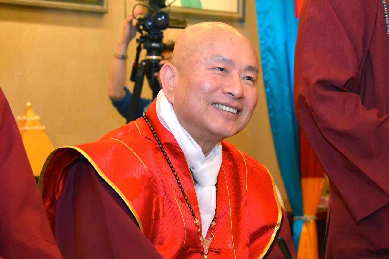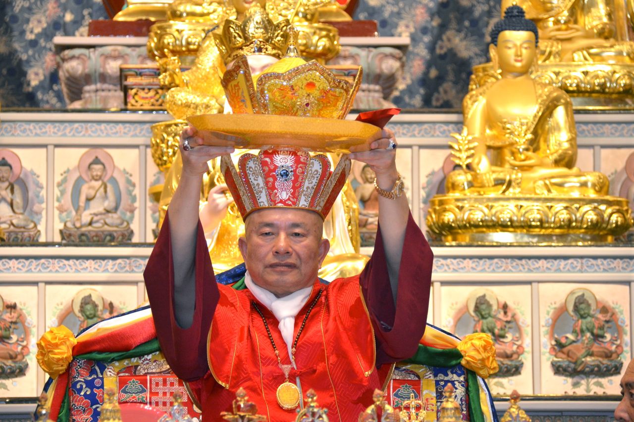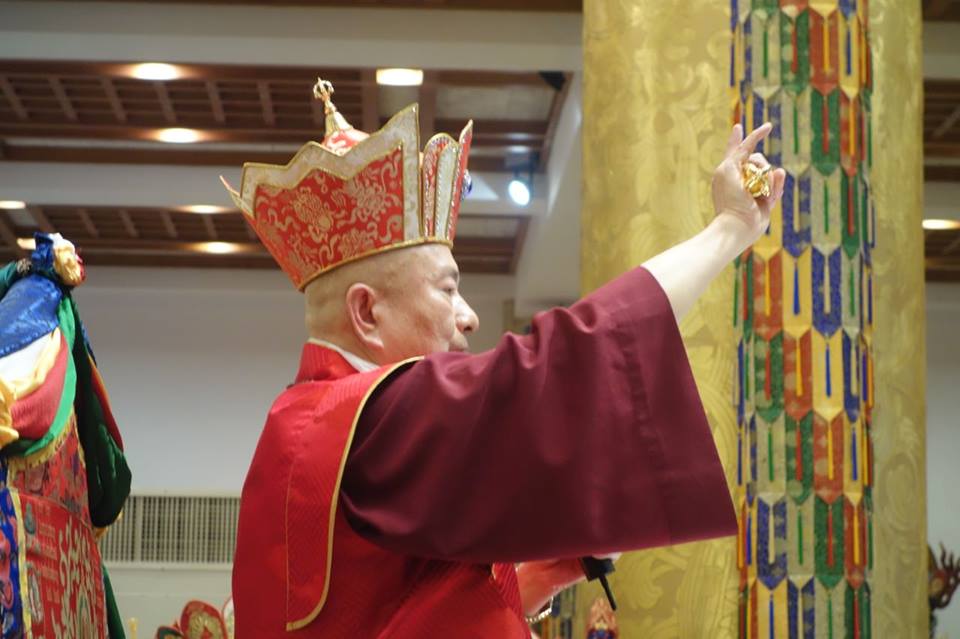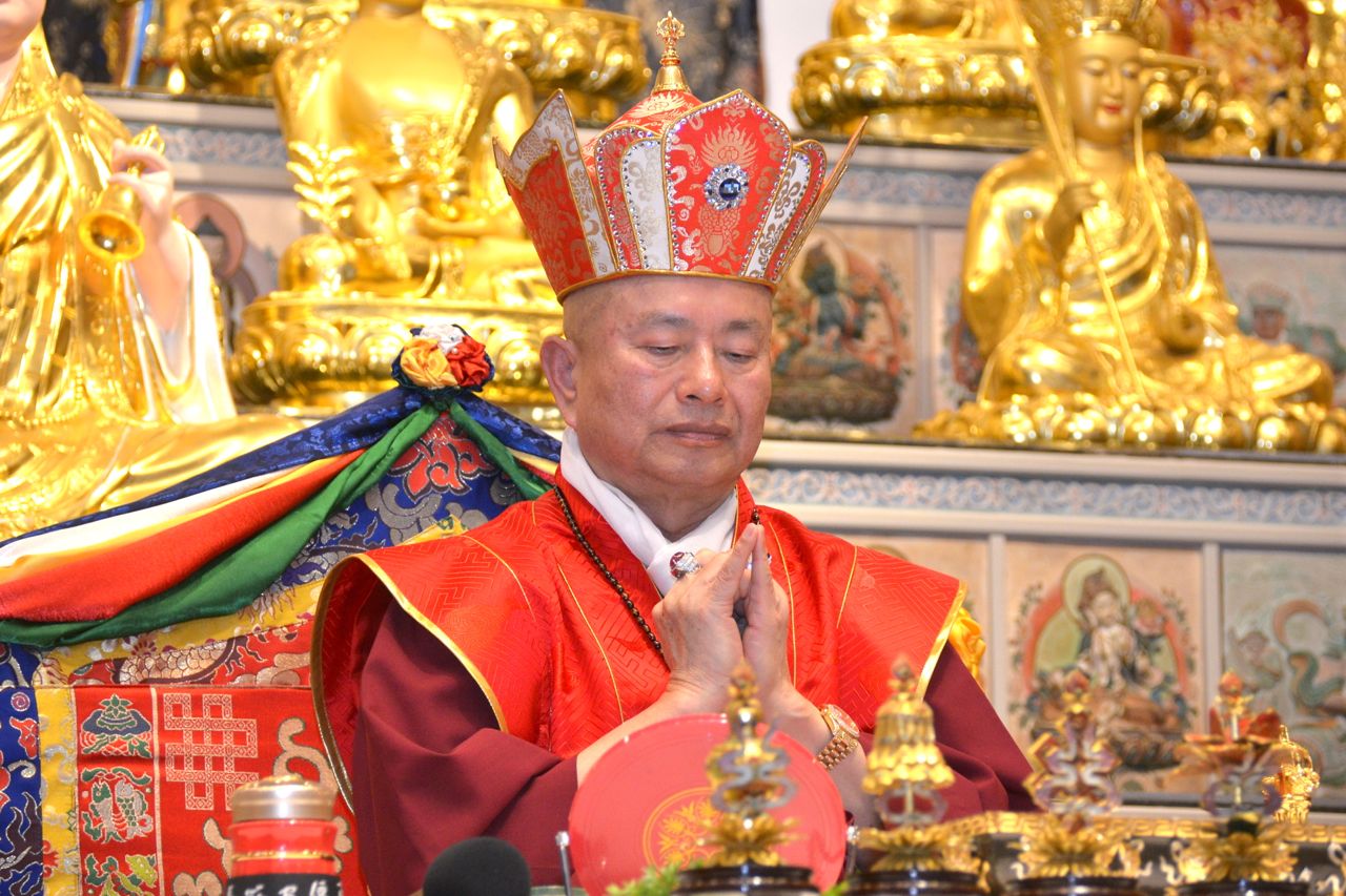 2015年2月21日蓮生活佛 盧勝彥法王新春大年初三主持「紅財神護摩法會」。法會前,首先宣佈由常智上師推薦回信中心的蓮舅法師為金剛阿闍黎。