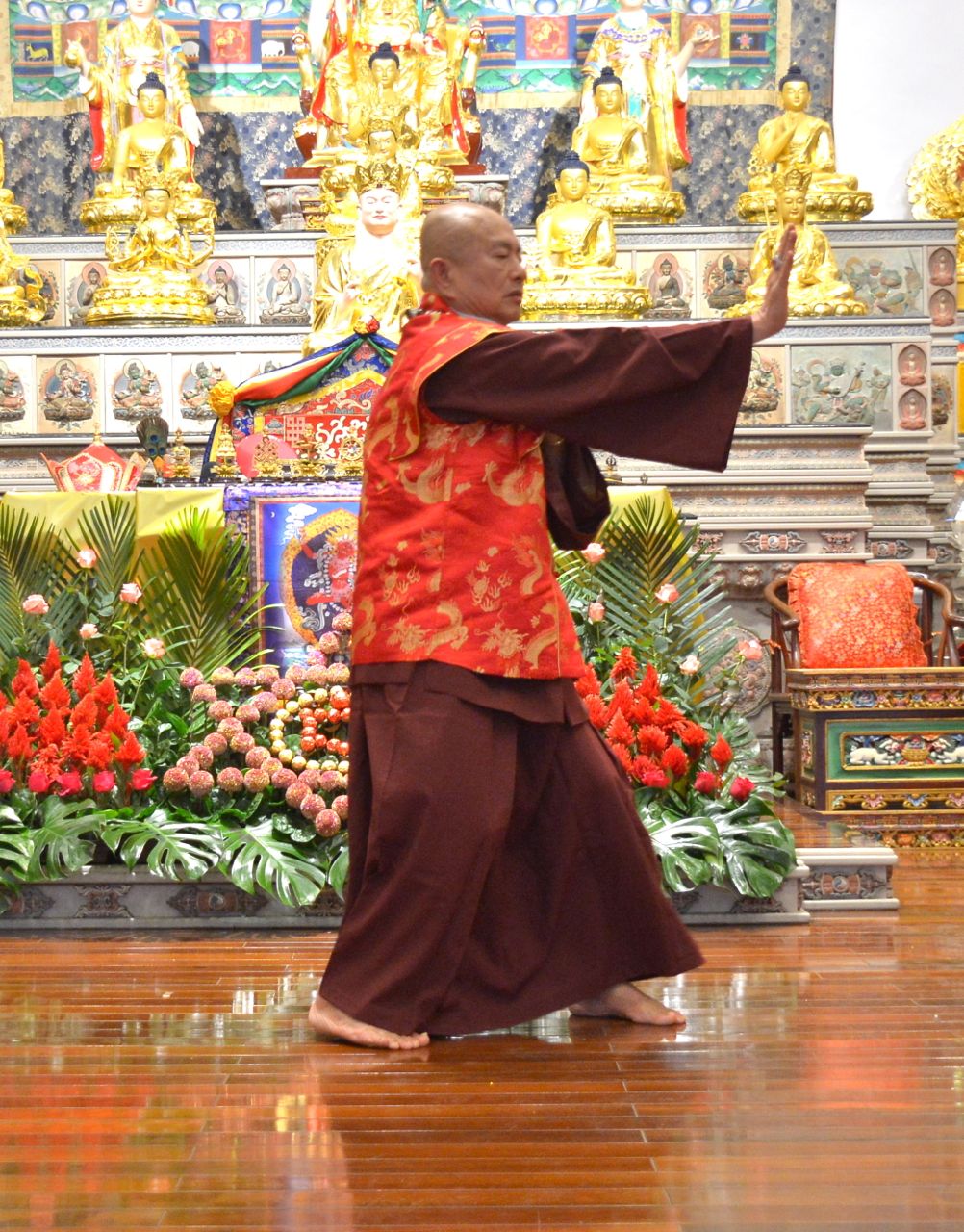 接著,在大家一陣熱烈掌聲中,蓮生活佛特別示範「十字拳」(男生的「金剛亥母拙火拳」;而蓮店上師示範的是屬於女生的「金剛亥母拙火拳」)