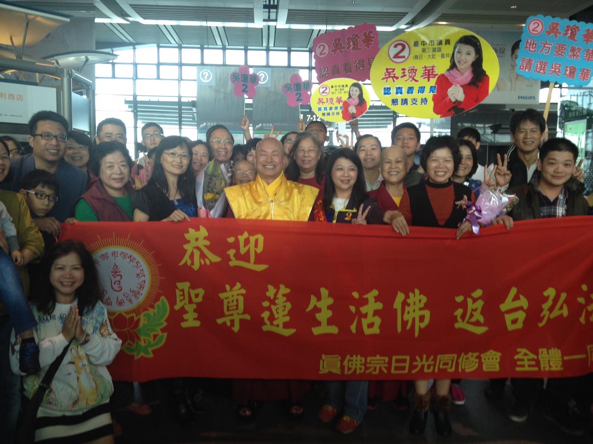 當蓮生活佛的身影一出現在入境大廳時,現場一時歡聲雷動,來自全省各地的善信弟子,熱情洋益,精神抖擻,向蓮生活佛 師尊呼喊著:「師尊,我愛您;師尊,好想您…」。