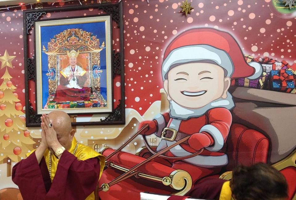 晚上六點,蓮生法王主持法會後於〈台灣雷藏寺〉用餐時,看見精心佈置的「聖誕老公公的大圖」,仔細一看,原來這位聖誕老公公畫的是「師尊」!
