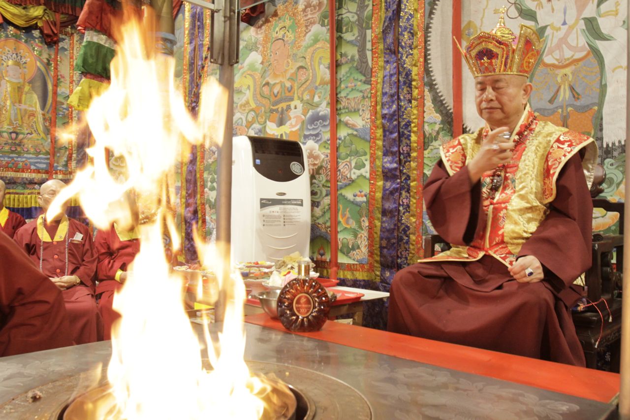 中午聖尊蓮生法王先為「賓頭盧尊者」開光,下午三點〈彩虹雷藏寺〉大殿和護摩寶殿會場都坐滿,眾人恭迎聖尊蓮生法王入壇場主持,為護摩爐供品下爐,演化息增懷誅大手印。法會上大家專注的唸誦勾財天女心咒『嗡。麻若哈日啊。哈日啊。嗡。引庫薩。引庫薩。些些些。吽吽吽。呸。梭哈。』勾財天女往昔無量之善行,證得財壽及威德,母向行者施財寶,增財佛母我敬禮。