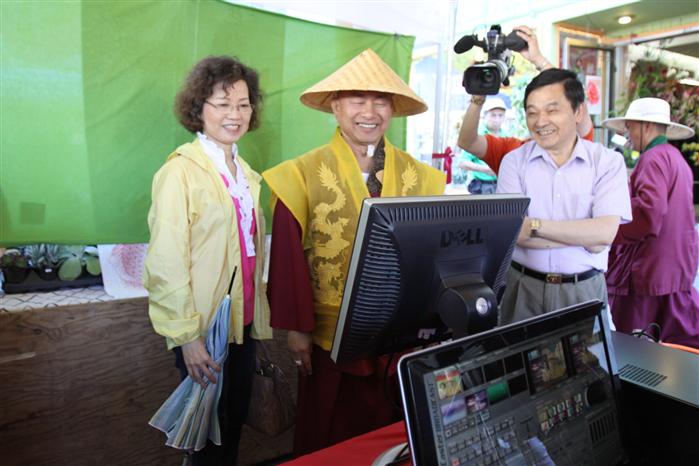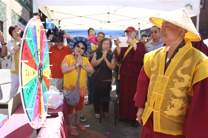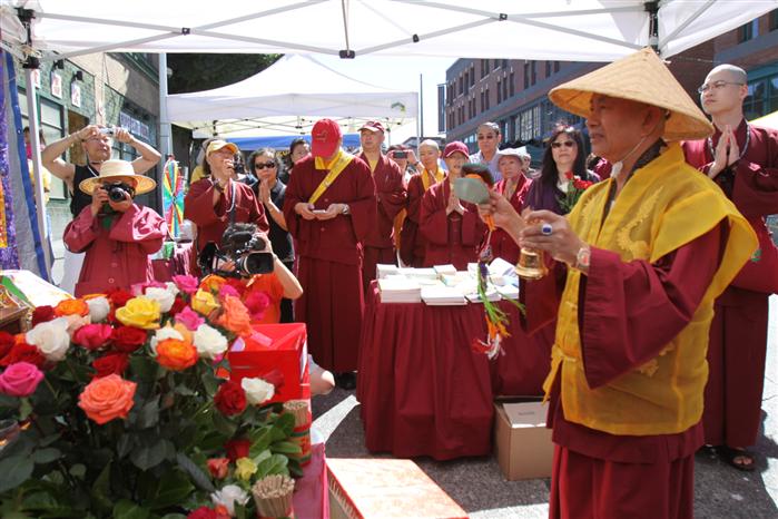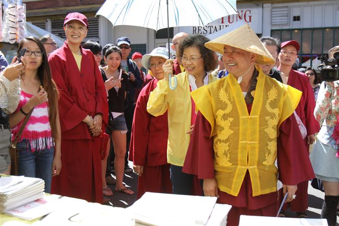 上午11時正,蓮生活佛 盧勝彥法王及蓮香師母抵達位於中國城的活動會場,在場的同門熱烈歡迎蓮生法王的到來。法王於雷藏寺的攤位上給予加持,並與同門義工合影留念,爾後與弟子們一同參與海洋節的慶典活動。