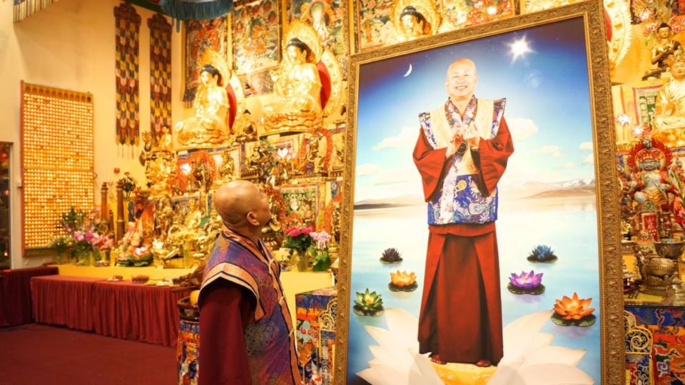 與大家分享,蓮生活佛 盧師尊與TONY師兄在〈西雅圖雷藏寺〉大殿上與巨幅等身相照片歡喜合影。