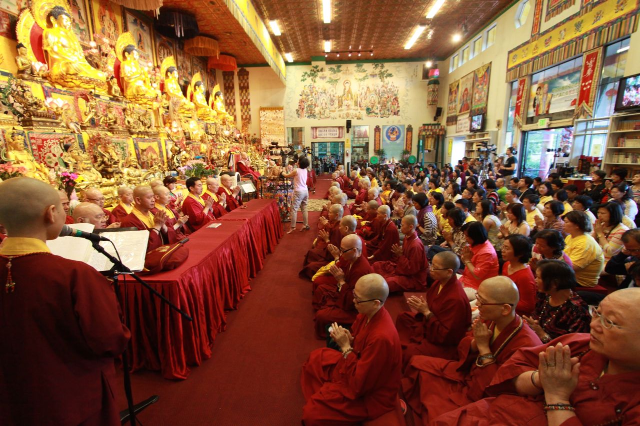 2014年6月21日週六,〈西雅圖雷藏寺〉壇城佈滿鮮花及各式供品,大家熱絡地準備同修。晚上八點許,善信齊聚,在司儀的帶領下,大眾專注持咒觀想,祈願藥師琉璃光王如來的賜福。