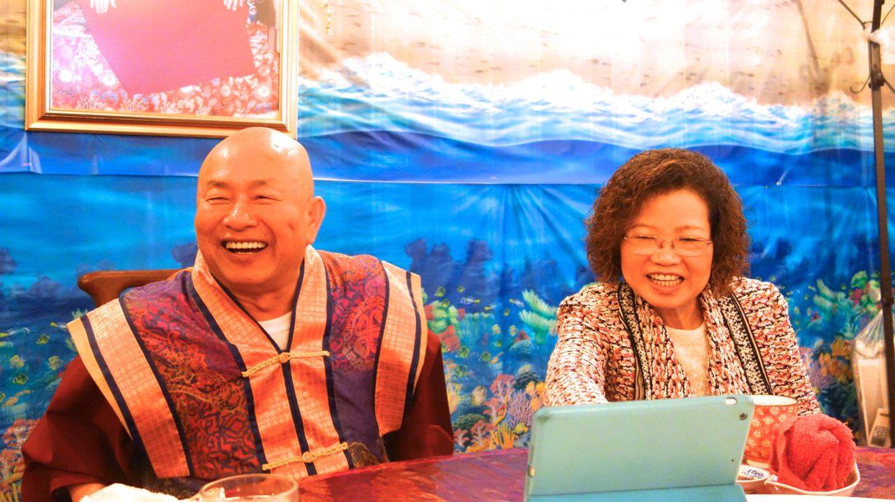 師尊、師母在看影片時,有時被影片中的情景逗得哈哈大笑,有時露出感動想念的神情…。