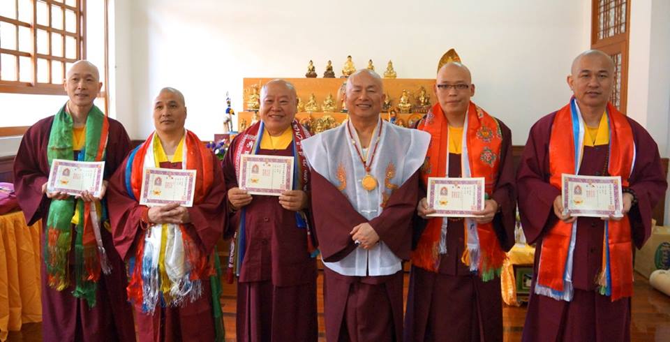 在地藏菩薩法會前,蓮生法王為五位新封上師賜授「上師灌頂」,期盼將來五位上師能承擔如來大業,廣度眾生。照片中的五位上師由右至左為:蓮余上師(台灣)、蓮菩上師(印尼)、蓮墻上師(韓國)、蓮欉上師(德國)、蓮將上師(英國)。