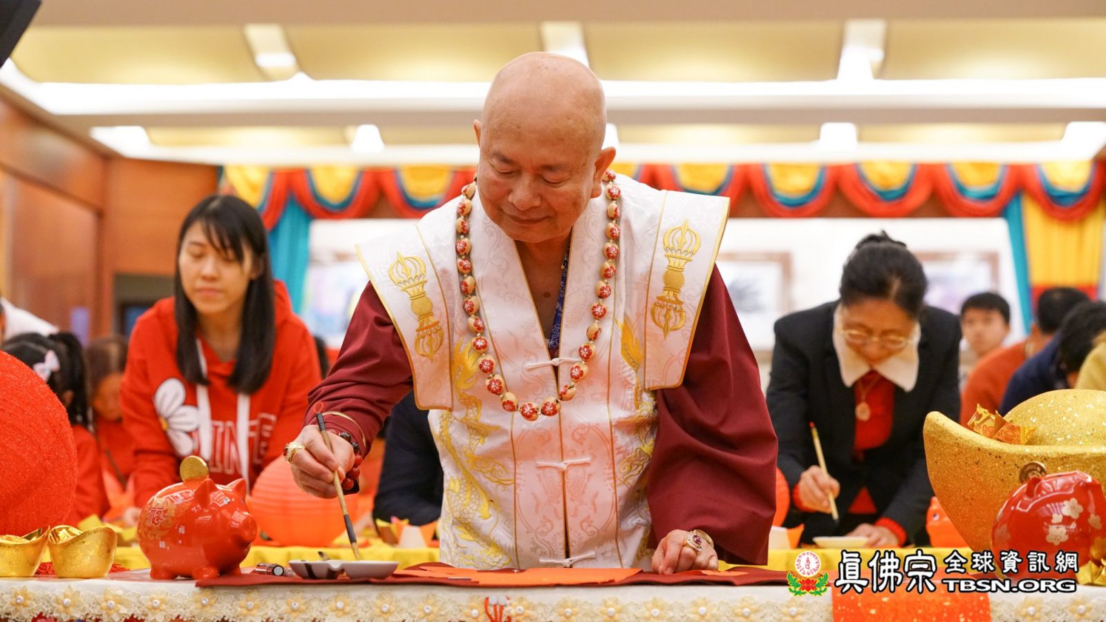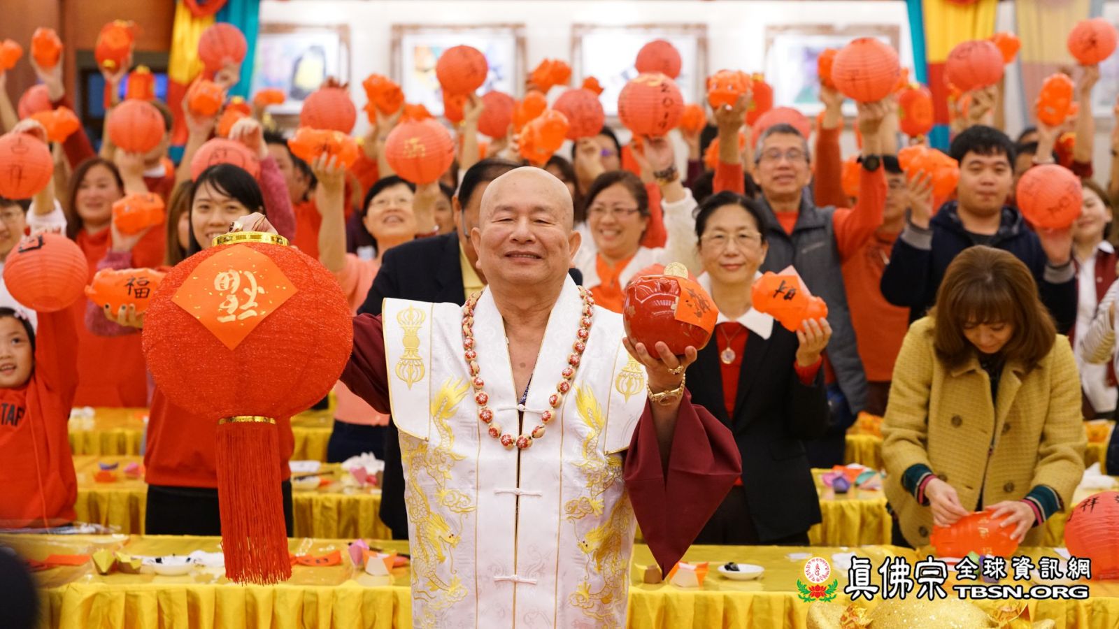 十一時許,法王蓮生活佛和師母蓮香金剛上師抵達台灣雷藏寺;弟子們見到了久違的師母,且精神飽滿地和師尊進行新春活動,諸弟子無不為她感到歡喜。師尊、師母先和大眾一起摺金元寶,願「金豬報喜!豬年吉祥!」而依師尊之前的開示,今年「接財神」要準備紅豬撲滿,主辦單位也準備了許多紅豬,及喜氣的紅燈籠讓大家題字;師佛先題了「滿」,象徵大眾「富貴滿滿,錢包滿滿」,再把「福」字倒貼在紅燈籠上,表示「福到了」!師母則在紅豬上題了個「祥」字,在紅燈籠上題了「吉」,呼應新年的「吉祥如意」!師尊和師母也跟大家一齊捧著紅豬和紅燈籠,喊道:「迎金豬,招財運,平安健康一整年!」令初一的台灣雷藏寺更顯得喜氣洋洋。