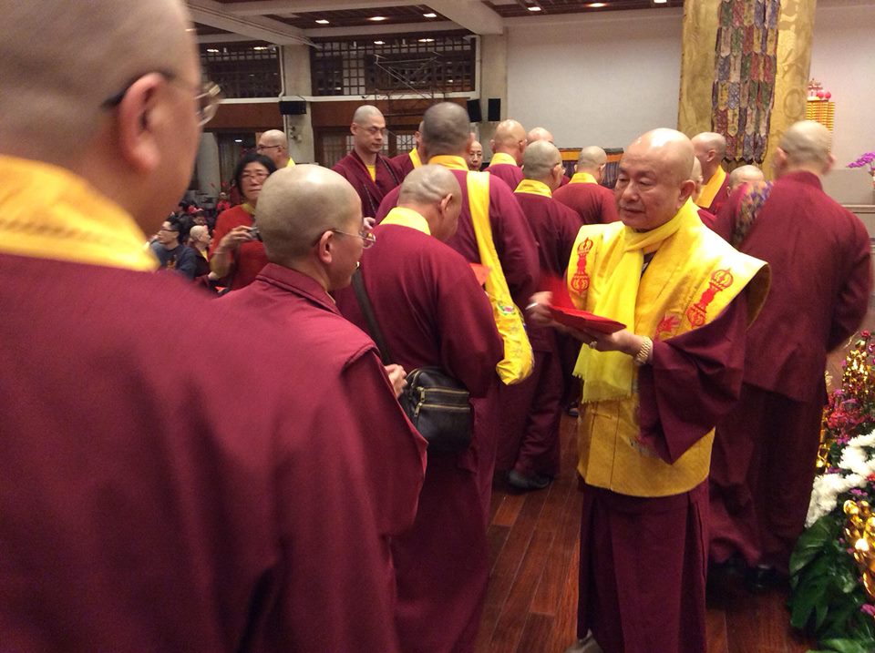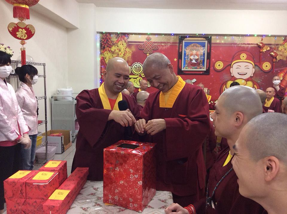 當師尊師母的身影一出現在〈台灣雷藏寺〉時,所有在場的弟子們歡聲雷動,這是一夜珍貴而充滿喜悅的團圓,能夠與師尊師母一同迎接新的一年,實在別具意義。晚餐前,〈台灣雷藏寺〉蓮哲上師、台灣密教總會理事長蓮歐上師代表獻供祝賀師尊、師母新春快樂。